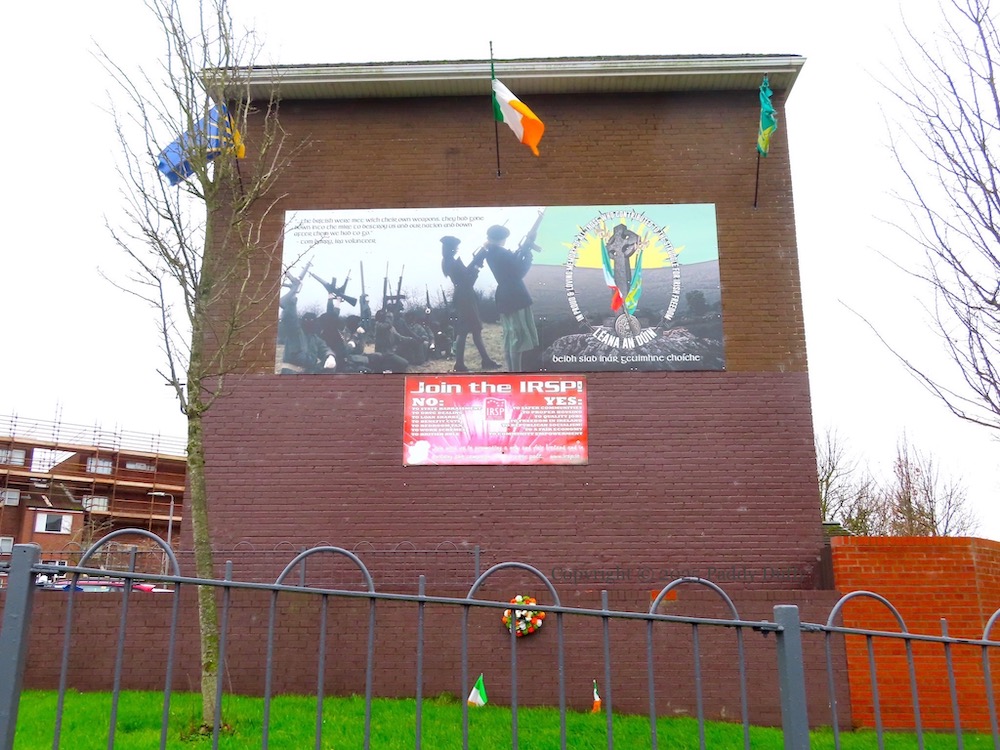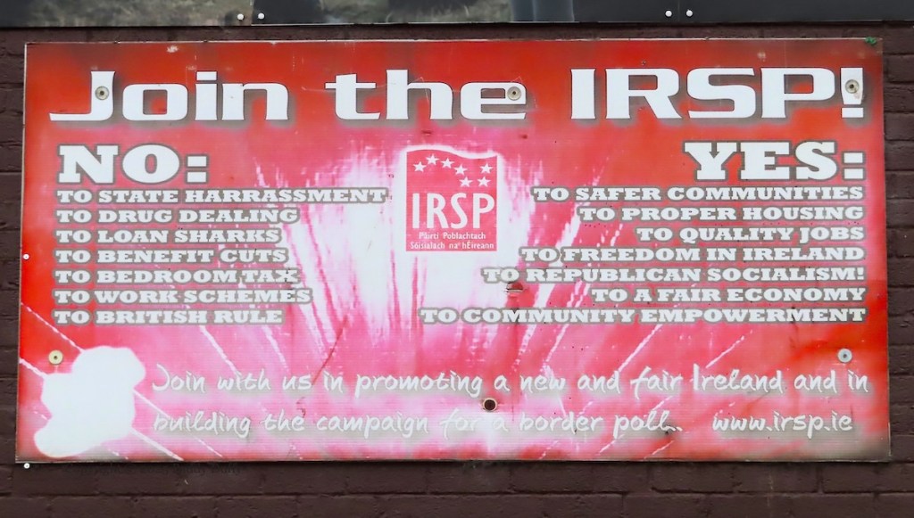 The red board below is an old (2019) IRSP board, reading, “Join the IRSP. No to state harassment, to dug dealing, to loan sharks, to benefit cuts, to bedroom tax, to work schemes, to British rule. Yes to safer communities, to proper housing, to quality jobs, to freedom in Ireland, to republican socialism!, to a fair economy, to community empowerment. Join with us in promoting a new and fair Ireland and in building the campaign for a border poll. www.irsp.ie