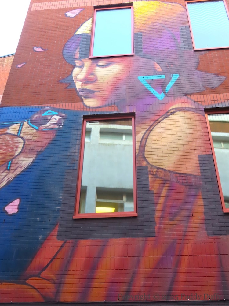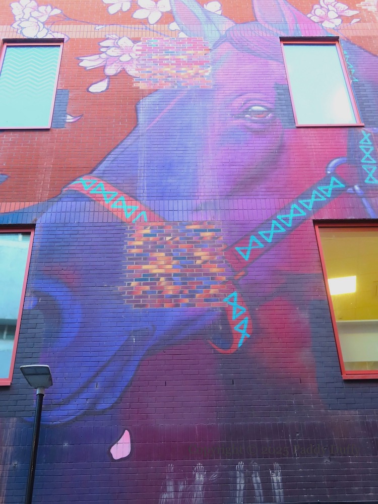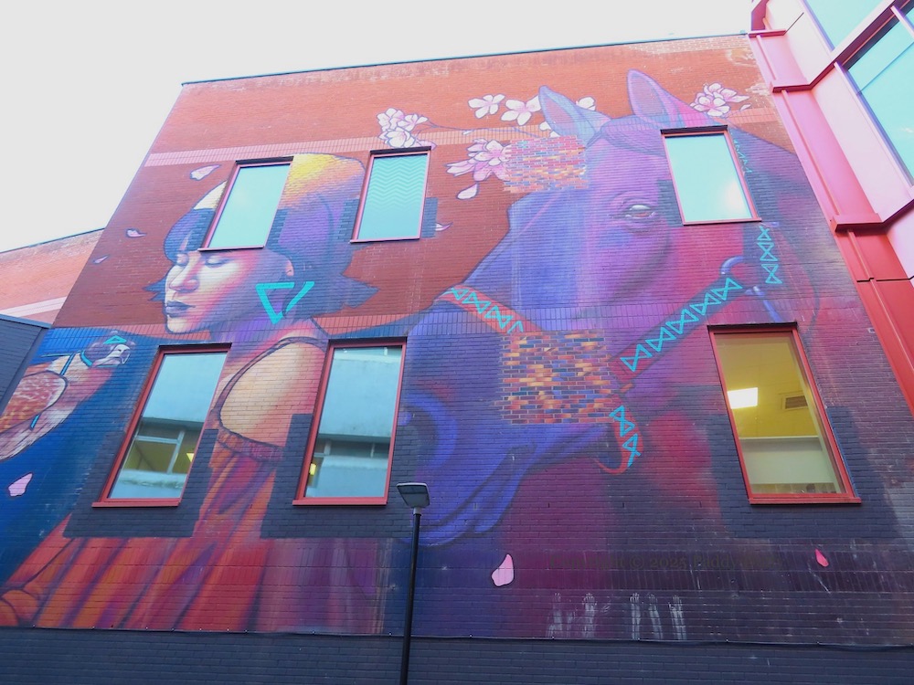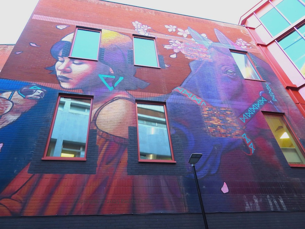 Work to the windows has been undertaken since this art was originally painted (in 2023) by Friz (web) and Gerry Norman (ig); two windows have been bricked up with multi-coloured bricks (best seen in the image immediately below), while others have been extended and narrowed, resulting in patches of black bricks (see the third and fourth images).