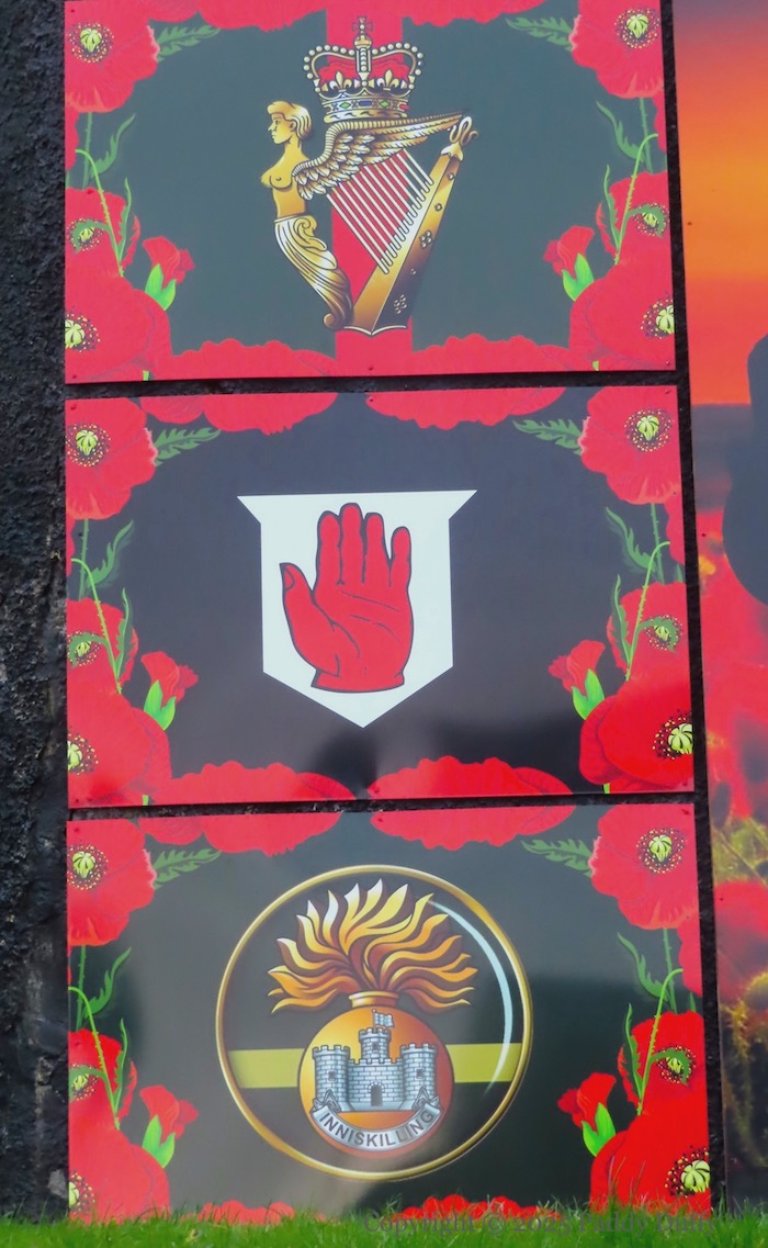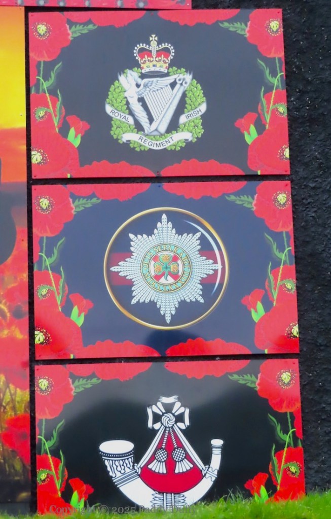 On the left (top to bottom): Royal Irish Rifles (later the Royal Ulster Rifles), 36th (Ulster) Division, Royal Inniskilling Fusiliers; on the right: Royal Irish Regiment, Order Of St Patrick, British Light Infantry.