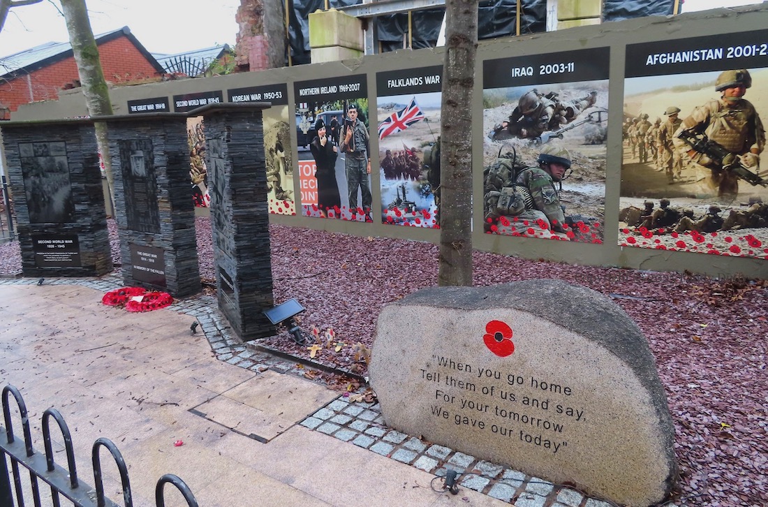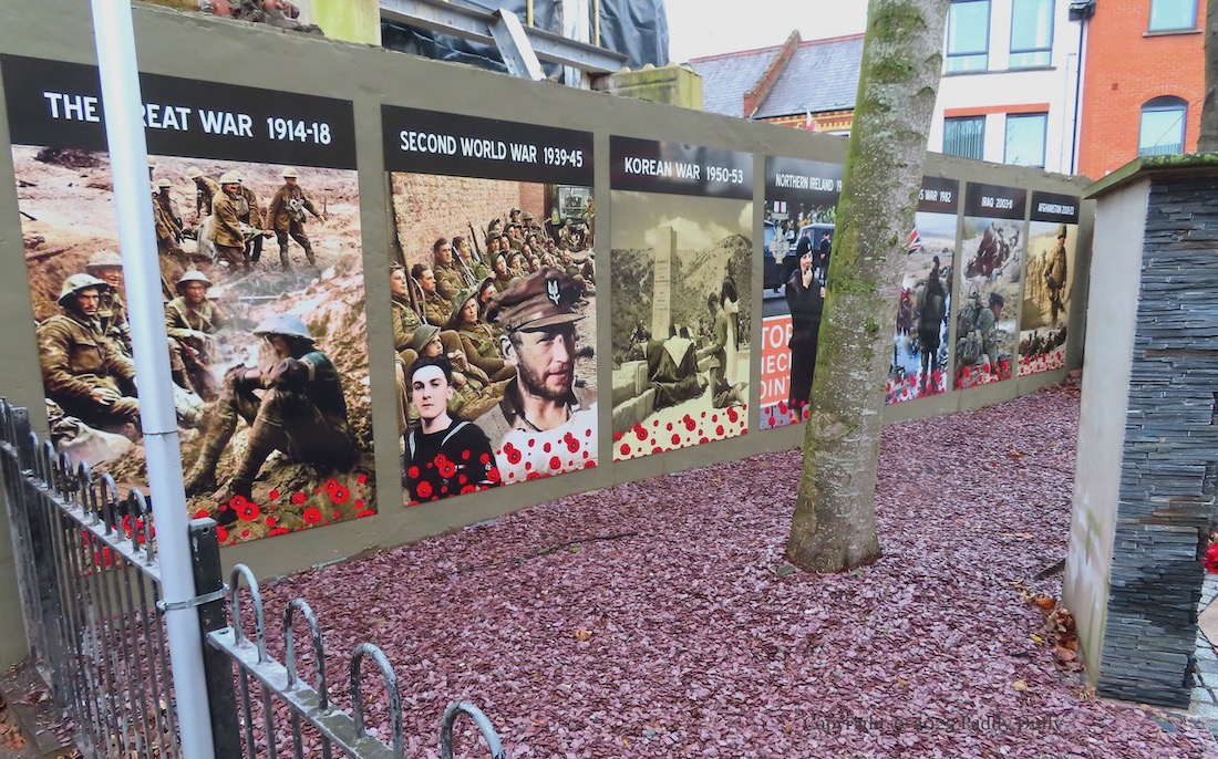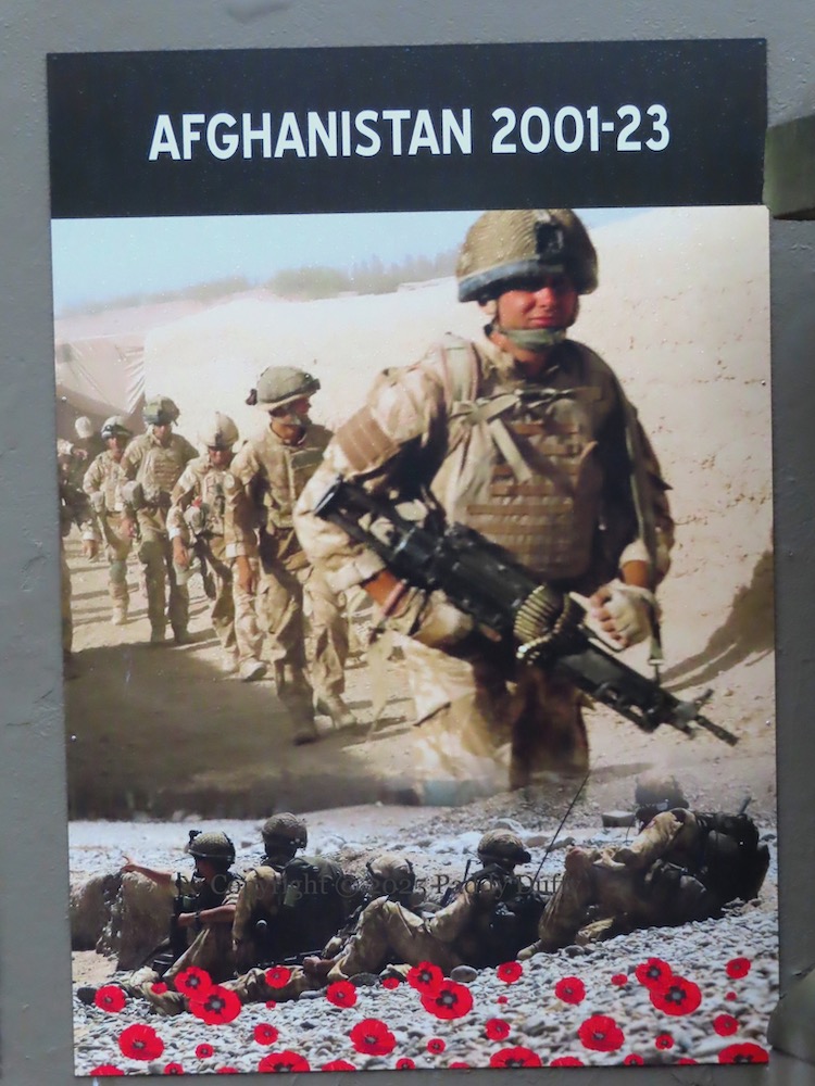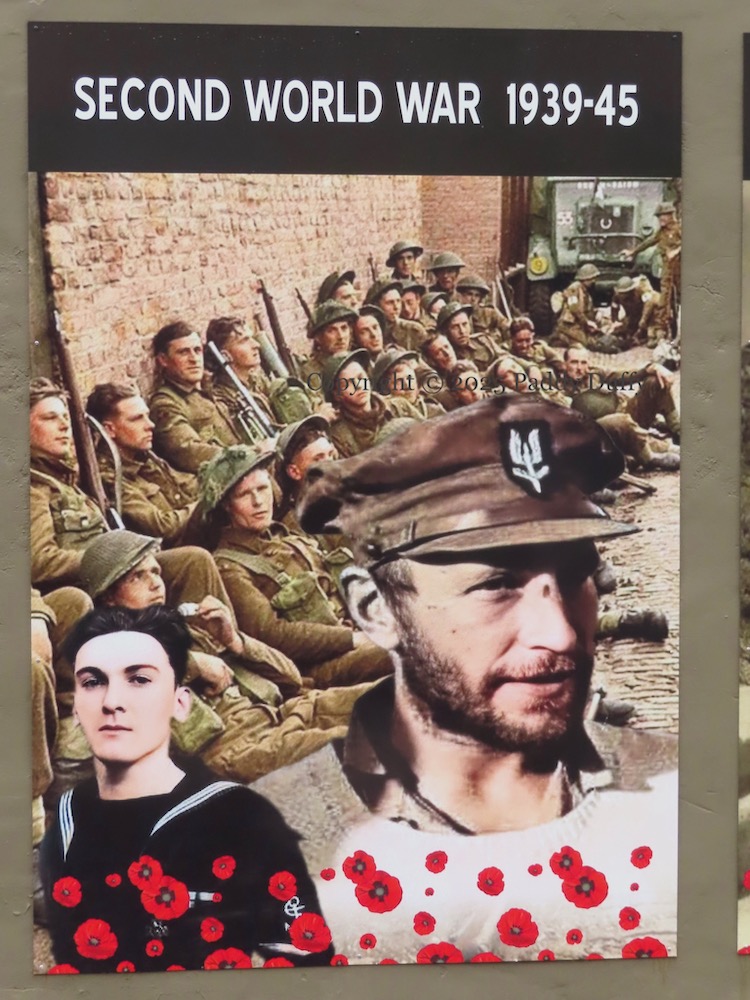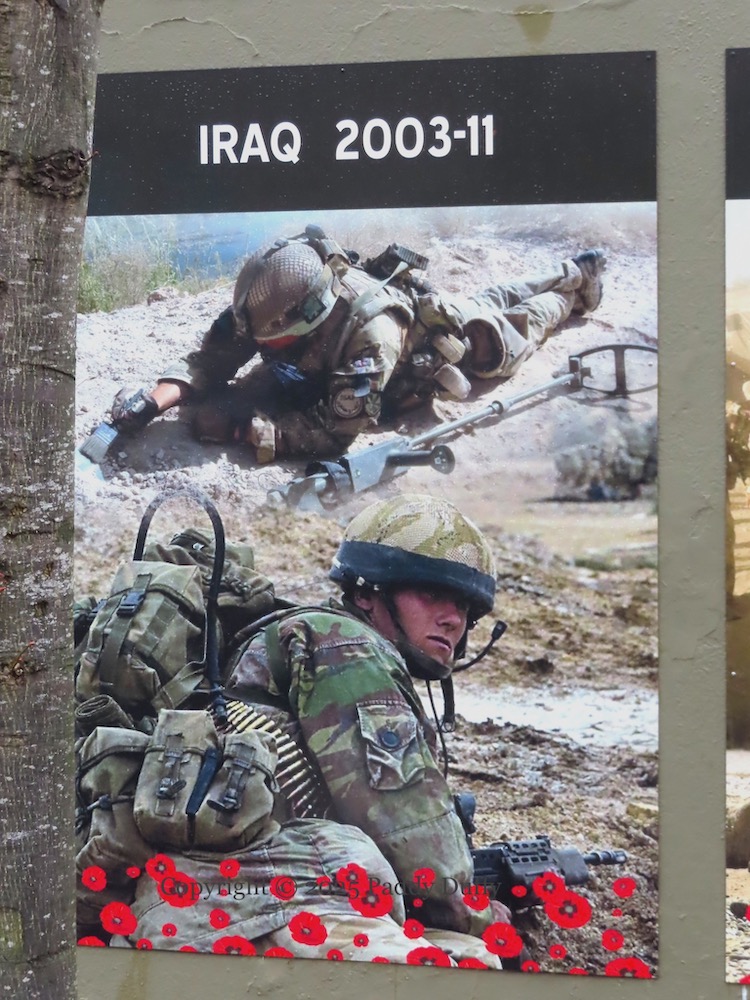 Printed panels illustrating the engagements of the British Army in the twentieth and twenty-first centuries have been added to the three stones (seen in Continuing Conflicts) that marked the World Wars and “continuing conflicts”. The conflicts depicted are the Great War 1914-1918, Second World War 1939-1945 (with individual photos of James Magennis and Blair Mayne, Korean War 1950-1953, Northern Ireland 1969-2007, Falklands War 1982 (the photo on the right is of troops “yomping”), Iraq 2003-2011, Afghanistan 2001-2023.
