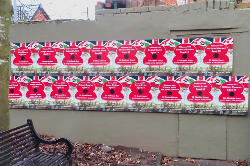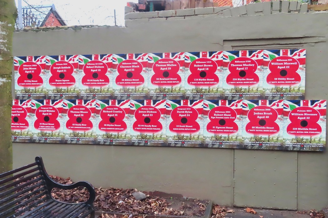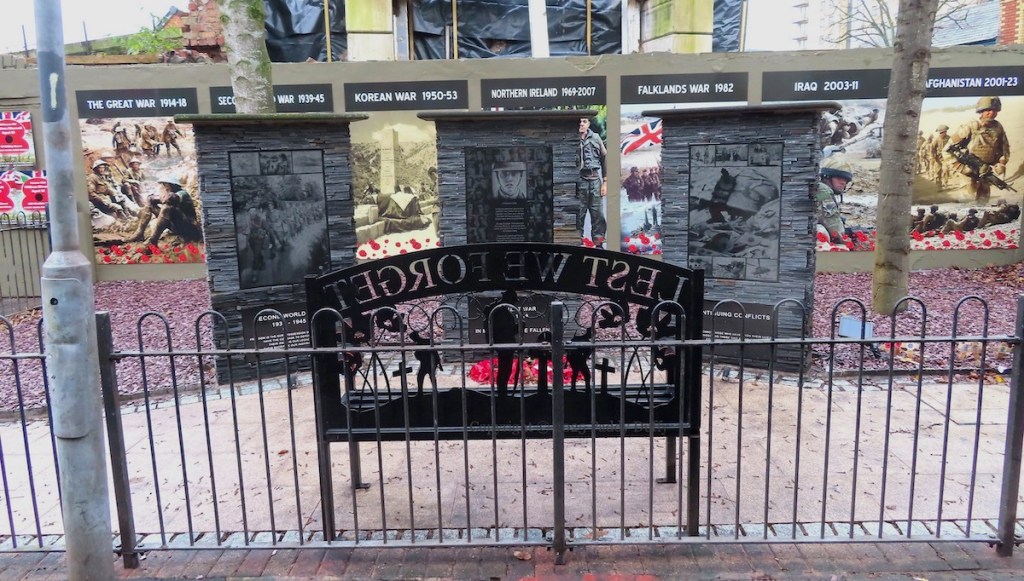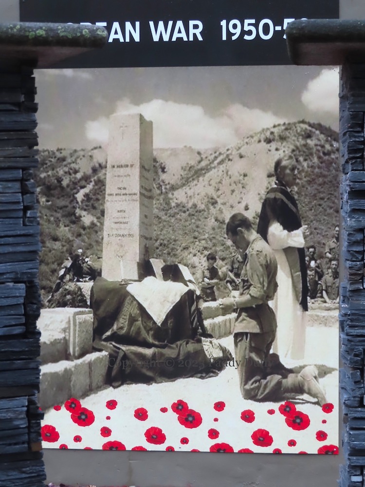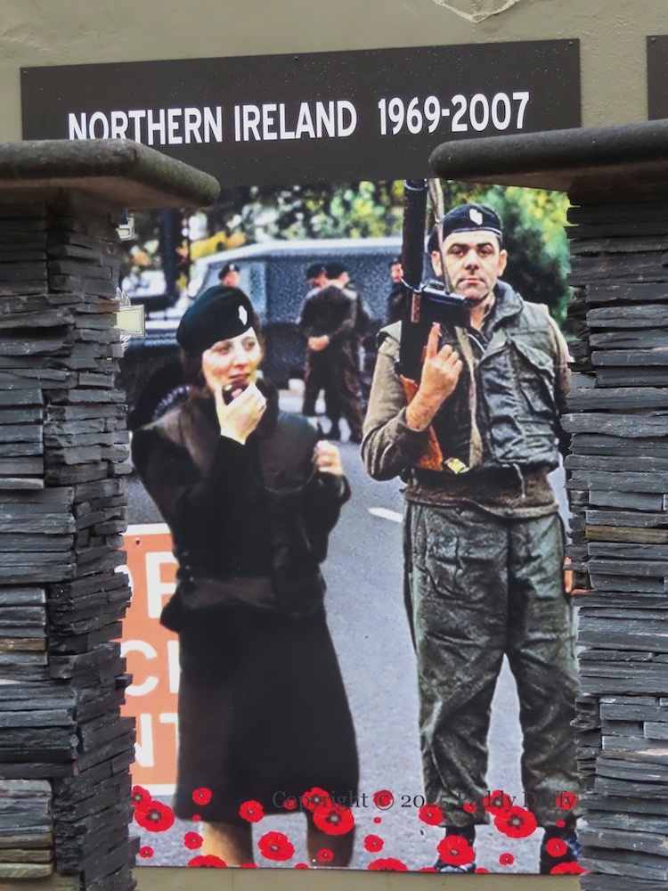 Printed panels illustrating the engagements of the British Army in the twentieth and twenty-first centuries have been added to the three stones (seen in Continuing Conflicts) that marked the World Wars and “continuing conflicts”. The conflicts depicted are the Great War 1914-1918, Second World War 1939-1945 (with individual photos of James Magennis and Blair Mayne, Korean War 1950-1953, Northern Ireland 1969-2007, Falklands War 1982 (the photo on the right is of troops “yomping”), Iraq 2003-2011, Afghanistan 2001-2023.