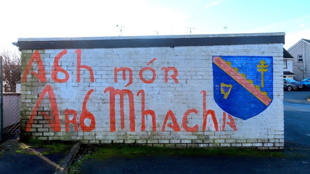 “Ádh mór Ard Mhacha” – The board below is from Armagh’s successful 2024 campaign in the senior football championship. The painted well-wishes in the image above might come from 2002, which is the year of Armagh’s only other All-Ireland win, but perhaps from one of the years in which Armagh were Ulster champions (2004, 2005, 2006 or 2008), as the earliest recorded image of it is from 2010.