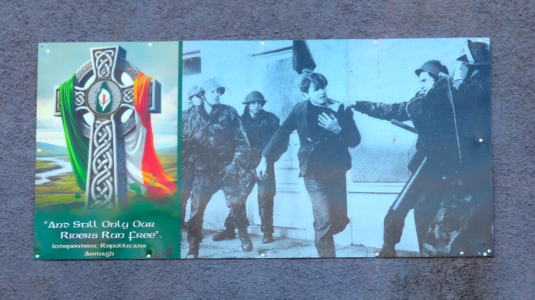 The photograph on the right is real: it shows British troops collaring a civilian in Coalisland in December 1971 – photographer unknown. The image on the left – a Celtic cross draped with a Tricolour – is AI slop. The first (or at least, an early and prominent) use of AI to produce images was Stop The Slaughter In Gaza from November 2023, and it is becoming more frequent in printed boards and wall-painting.