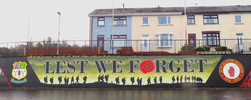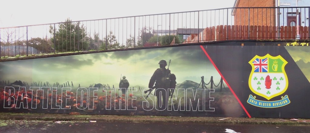 The badge or insignia of the 36th (Ulster) Division most frequently seen in murals is the one on the left of this board in Ballyduff, combining a red hand on a field of shamrocks with the Union Flag and the harp of the Royal Irish Rifles. The simpler insignia of the 36th Division on the right is being seen more frequently – it features a left-handed red hand, while the other uses a right-handed red hand, as do the flags of Ulster and of Northern Ireland.