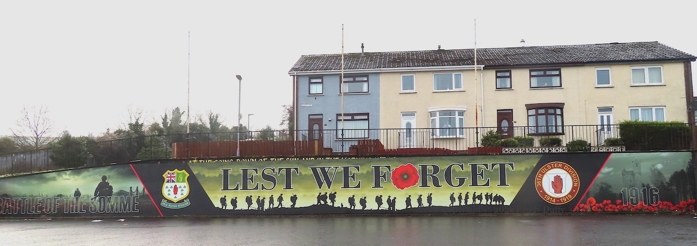 Ballyduff Gardens, Newtownabbey, replacing a painted mural seen in It Grows In Fields Where Valour Led.
