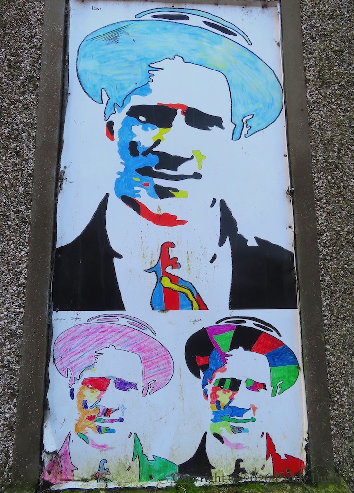 “Portrait paintings by pupils of the William Pinkerton Memorial primary school, Dervock. Homage to Kennedy Kane McArthur, 1881 – 1960, Local hero and Olympian. Dervock born and bred.”