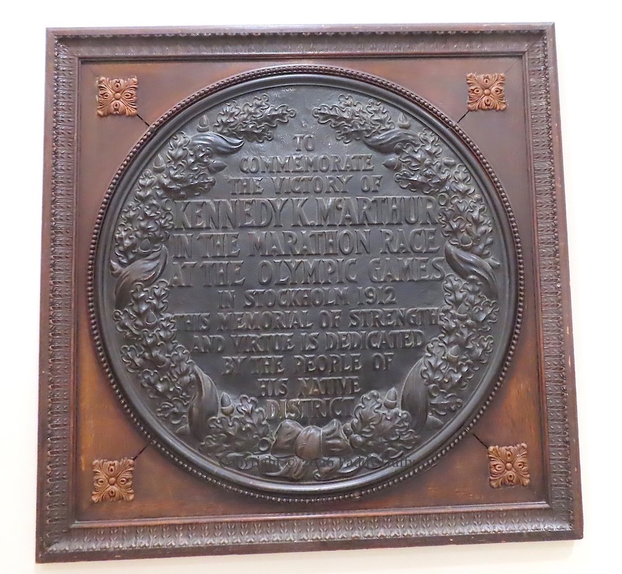 The large medallion is in the visitor centre in Townsend Street, Ballymoney. It reads, “To commemorate the victory of Kennedy K. McArthur in the marathon race at the Olympic Games in Stockholm 1912. This memorial of strength and virtue is dedicated by the people of his native district.”