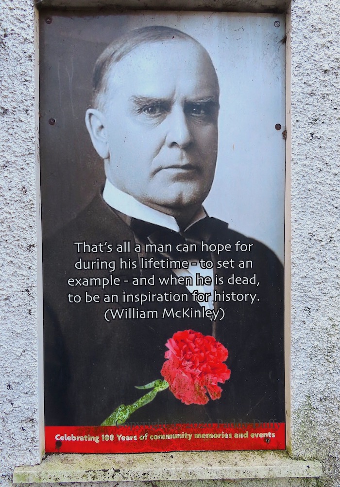 The President is “William McKinley (1843-1901) 25th President of the United States … from 1897-1901. McKinley was immensely proud of his North Antrim ancestry. His great, great, grandfather, James, left his home place in the townland of Conagher, near Dervock in 1743 and sailed for American. James eventually settled in Niles, Ohio, where the future President was born on 29 January 1843. … “That’s all a man can hope for during his lifetime – to set an example – and when he is dead, to be an inspiration for history.””