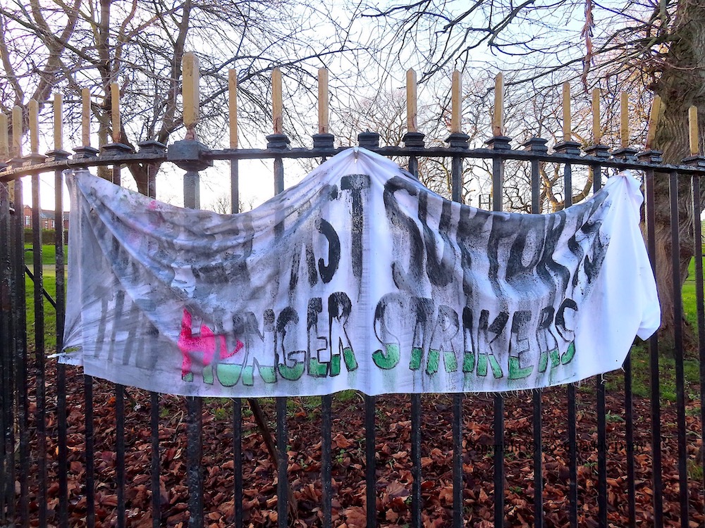 This washed-out banner is on the Antrim Road, north Belfast, on the railings of the Waterworks.