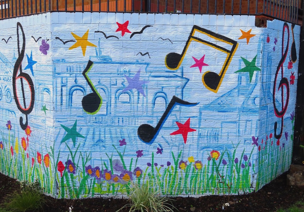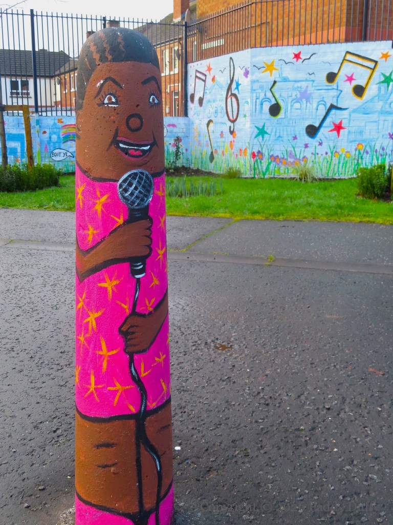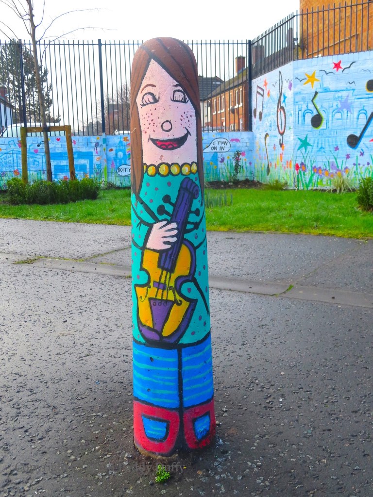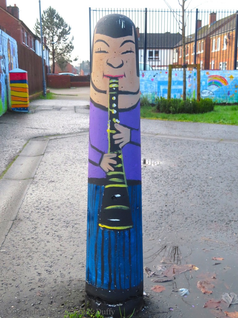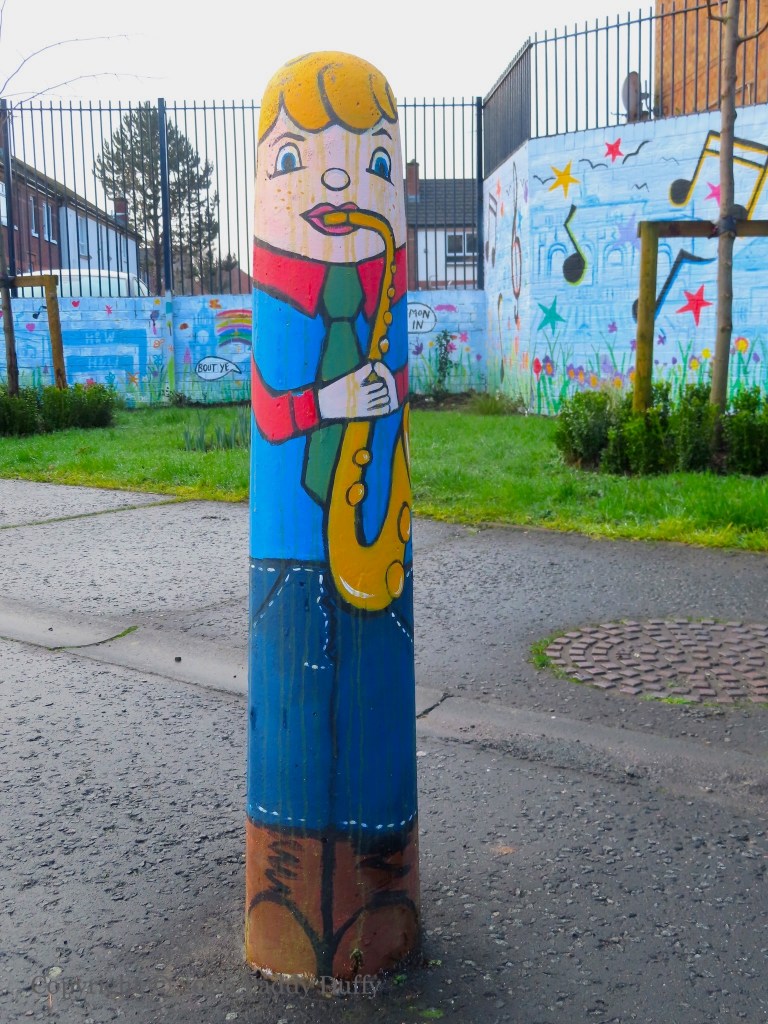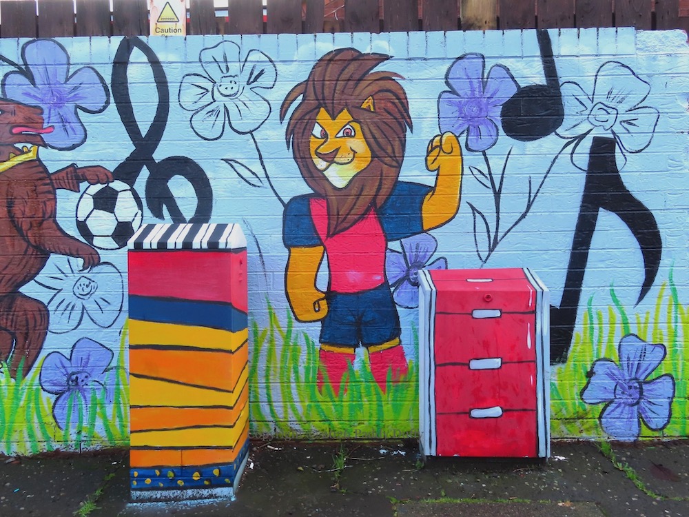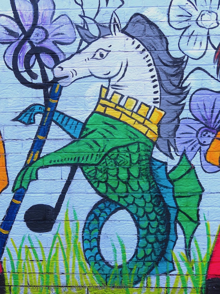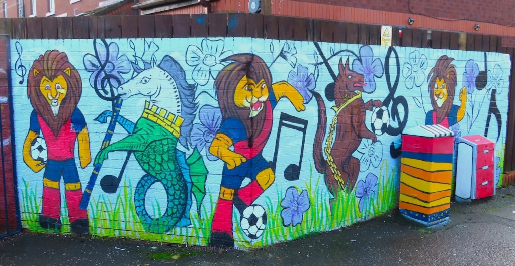 This entry updates 2025’s C’Mon On In, which showed the low wall with local landmarks. The new pieces on the adjacent wall, the six bollards and three pillars, have a musical theme. The wall to the side depicts a sea-horse and a wolf (from the Belfast coat of arms – see The Sea Walls) among soccer-playing lions against a backdrop of flax flowers.