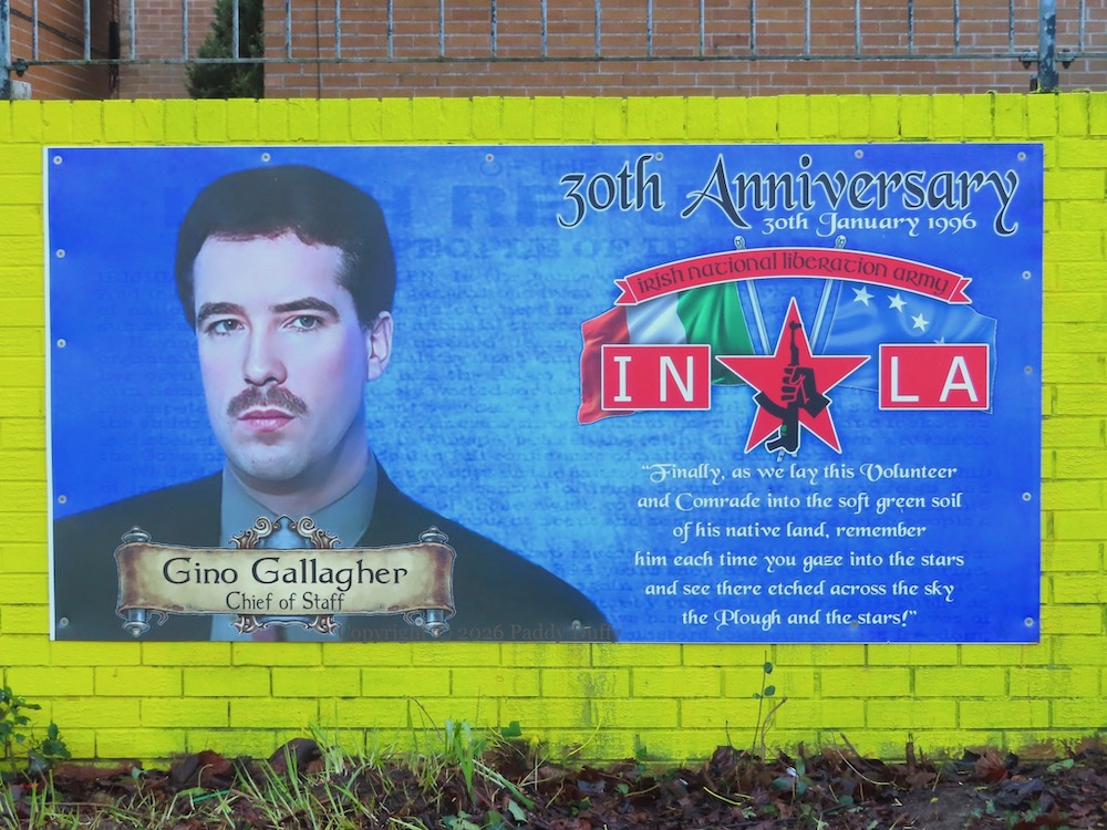 “Gino Gallagher, chief of staff, 30th anniversary, 30th January 1996. Irish National Liberation Army/INLA. “Finally, as we lay this volunteer and comrade into the soft green soil of his native land, remember him each time you gaze into the stars and see there etched across the sky the plough and the stars!””