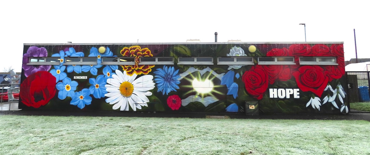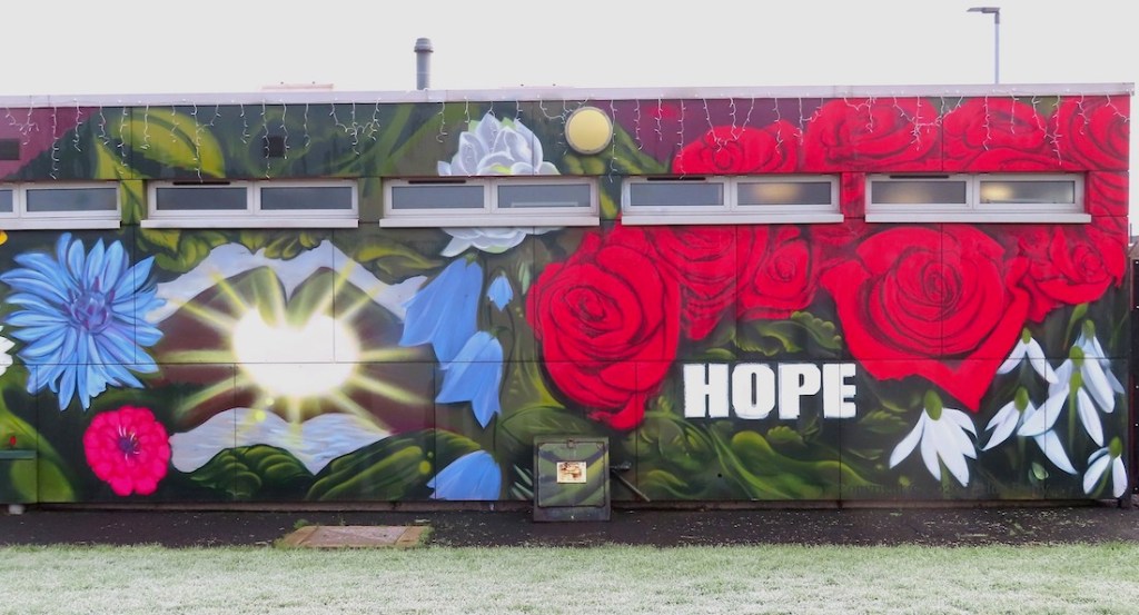 Or perhaps two separate injunctions, “remember” and “hope”. This is a new piece of street-art on a wall of the Ballyduff Community Centre (Fb), which is home to the Ballyduff Community Redevelopment Group (Fb).
