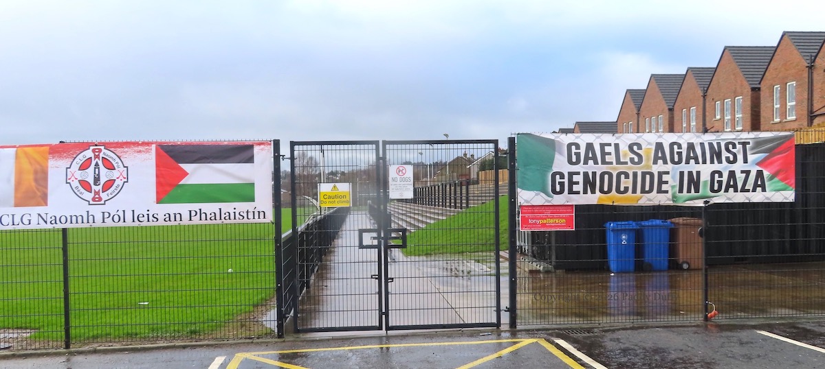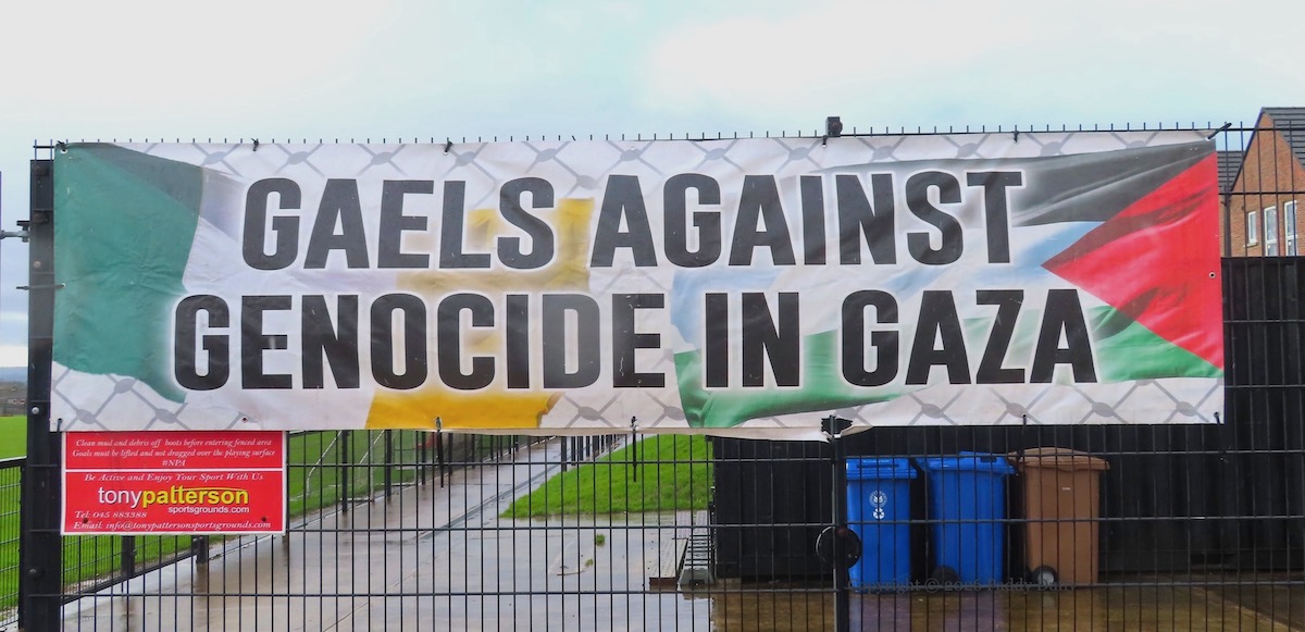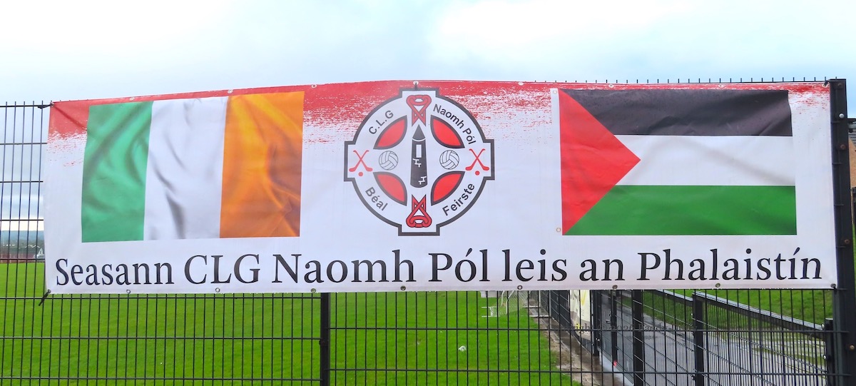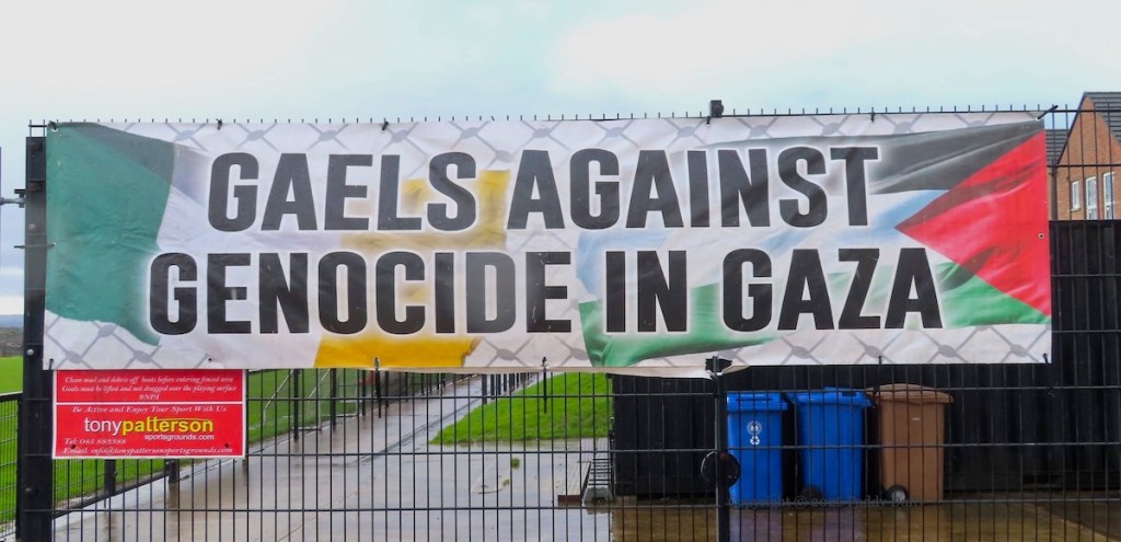“Gaels against genocide in Gaza”, “Seasann CLG Naomh Pól [web] leıs an Phalaıstín [St Paul’s GAC stands with Palestine]”.