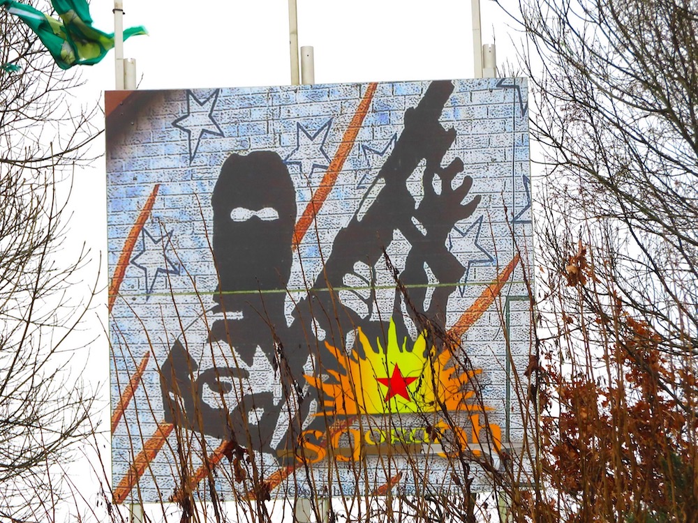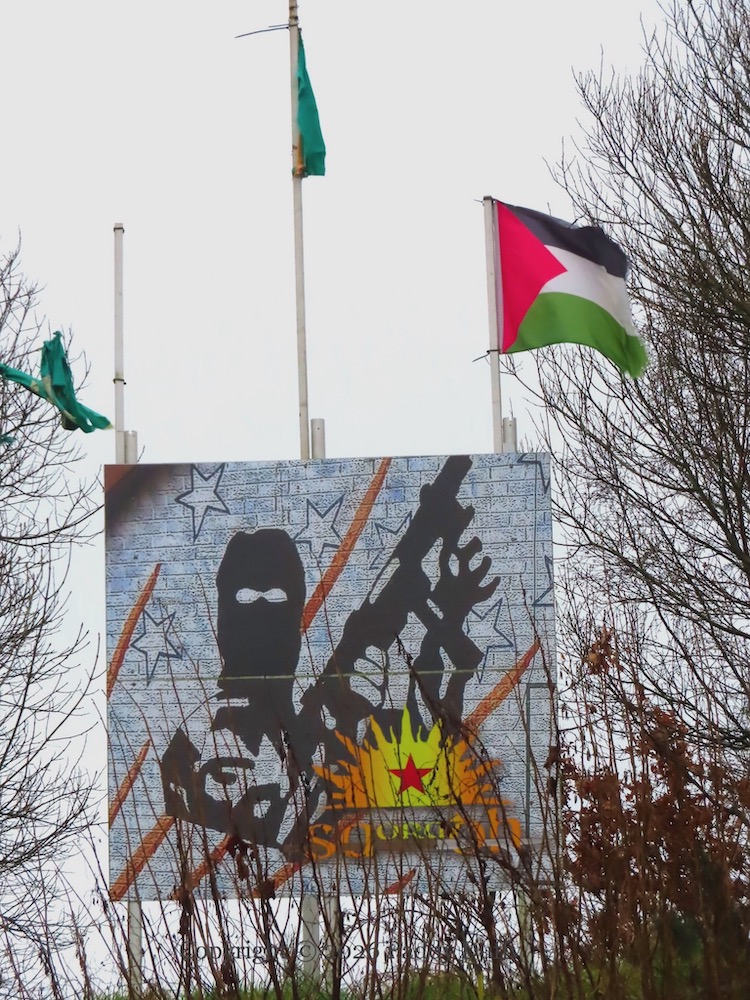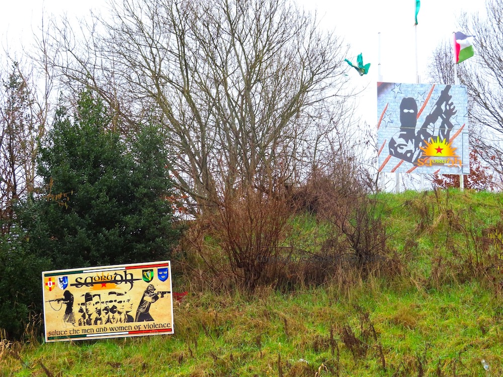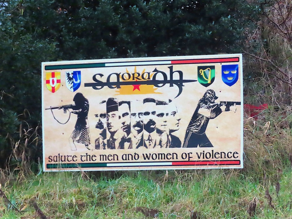 These two Saoradh (web) boards are at the roundabout on Camlough Road, Newry. The one above shows a vintage mural from nearby Carnagat Road that goes back to (at least) 1994 – the version painted in 2000 can be seen in the Peter Moloney Collection.