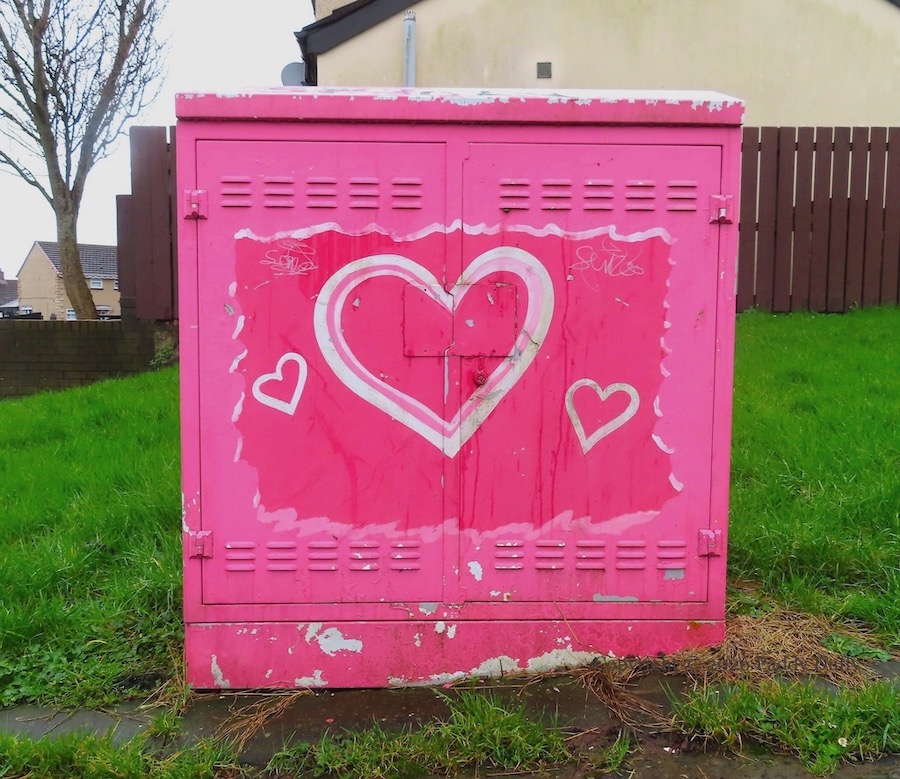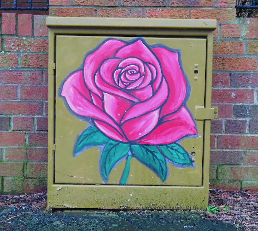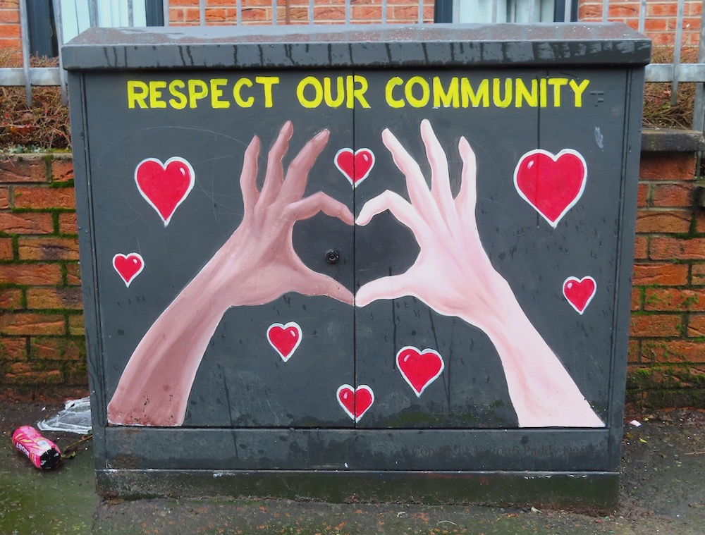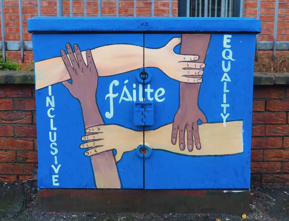 “Fáılte” [Welcome] to Moyard. The trend in painting electrical boxes (see the Visual History page) has been taken up in west Belfast. Here are three painted boxes from Springfield Park along with an additional box (the hearts) on the other side of the Springfield Road in Divismore Way, which join those seen in Bóthar Chluanaí, Gaırdín Na hÉıreann, and Perennials.