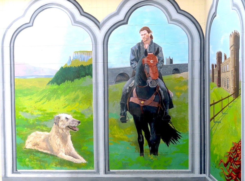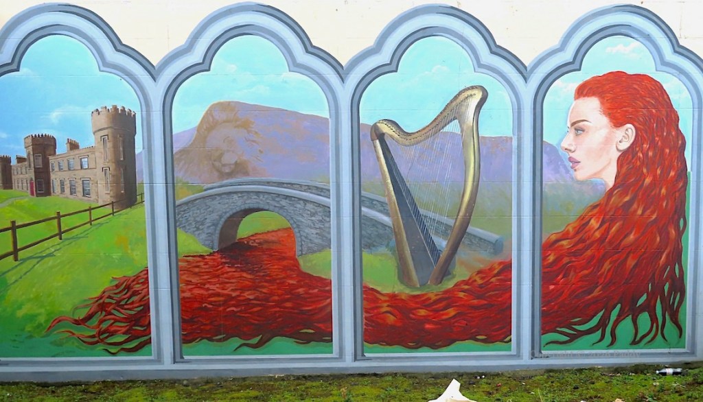 In this mural, Finvola’s long red hair represents the river, which flows towards Benbradagh Mountain.