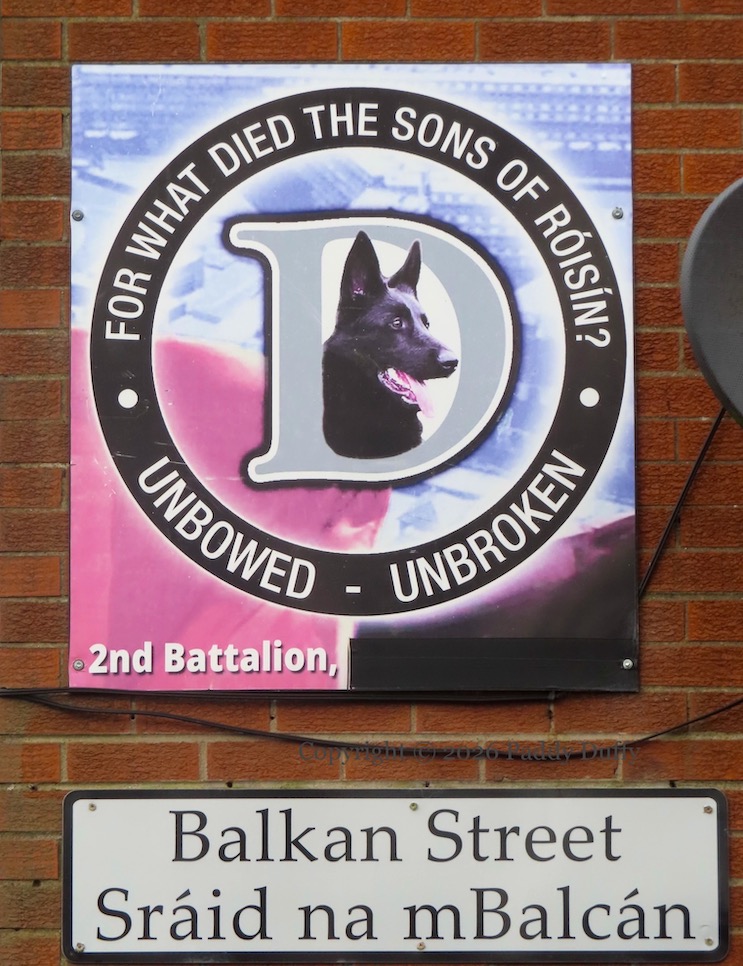 Below, “For what died the sons of Róısín [Dubh]?” The Dogs of IRA D company, second battalion [Belfast brigade] are “unbowed” and “unbroken”.