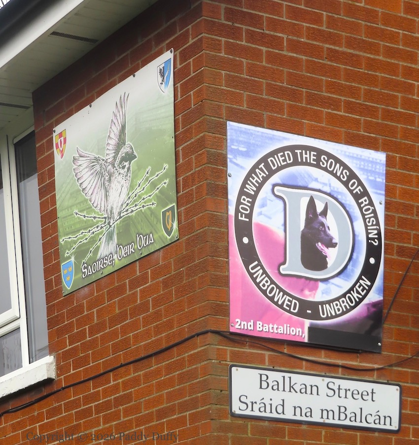 Below, “For what died the sons of Róısín [Dubh]?” The Dogs of IRA D company, second battalion [Belfast brigade] are “unbowed” and “unbroken”.