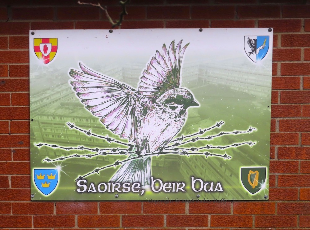 Above, “Saoırse [freedom]” and “beır bua [seize victory]” and imagery of the four provinces and a lark in barbed wire are on top of the old Divis flats. The flats were built to replace the tightly-packed streets of the lower Falls. After the first three blocks were completed in 1969, there was a plan to have a mixture of flats all the way up to Dunville Park (“Phase 2” in this 30-minute BBC video on the flats, which also includes the story of its eventual demise.