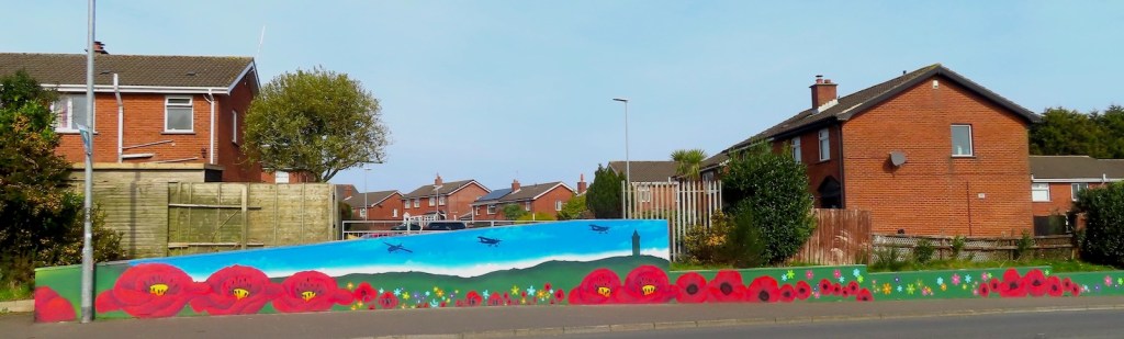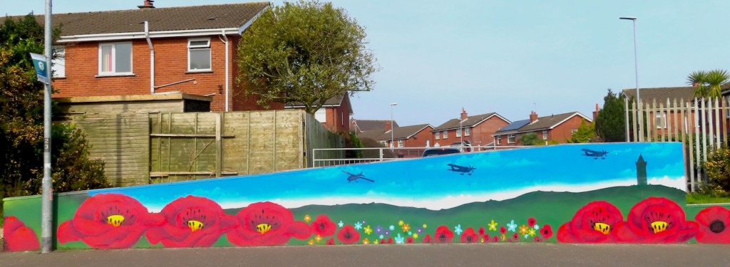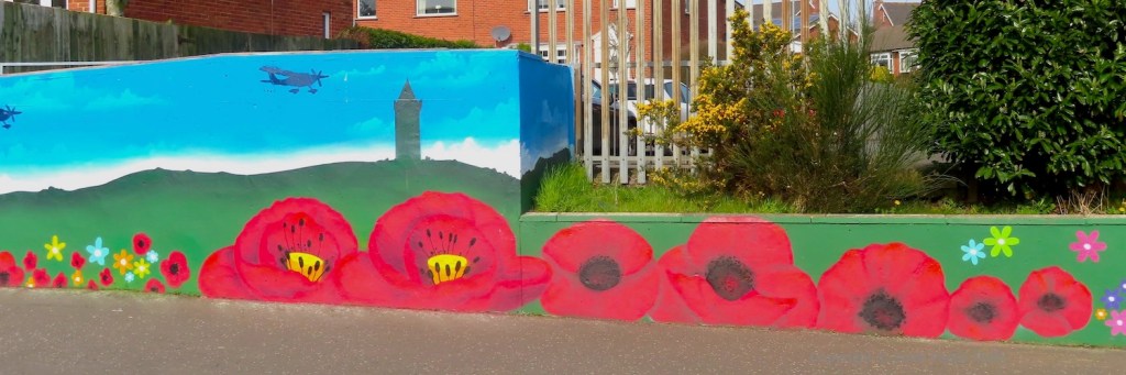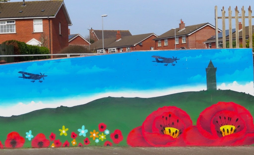 The poppies in this new mural suggest WWI, but the “pants” over the wheels of the planes shown here as they pass Scrabo tower suggest a post-war plane (or a modern light aircraft).