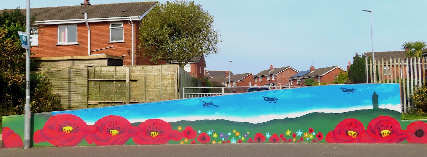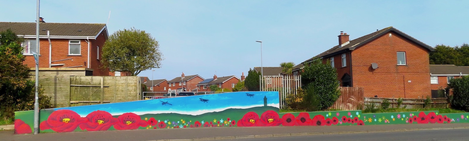 The poppies in this new mural suggest WWI, but the “pants” over the wheels of the planes shown here as they pass Scrabo tower suggest a post-war plane (or a modern light aircraft).