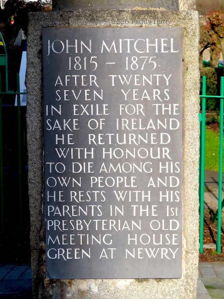 “John Mitchel 1815 – 1875 After twenty years in exile for the sake of Ireland he returned with honour to die among his own people and he rests with his parents in the 1st Presbyterian old meeting house green at Newry.”