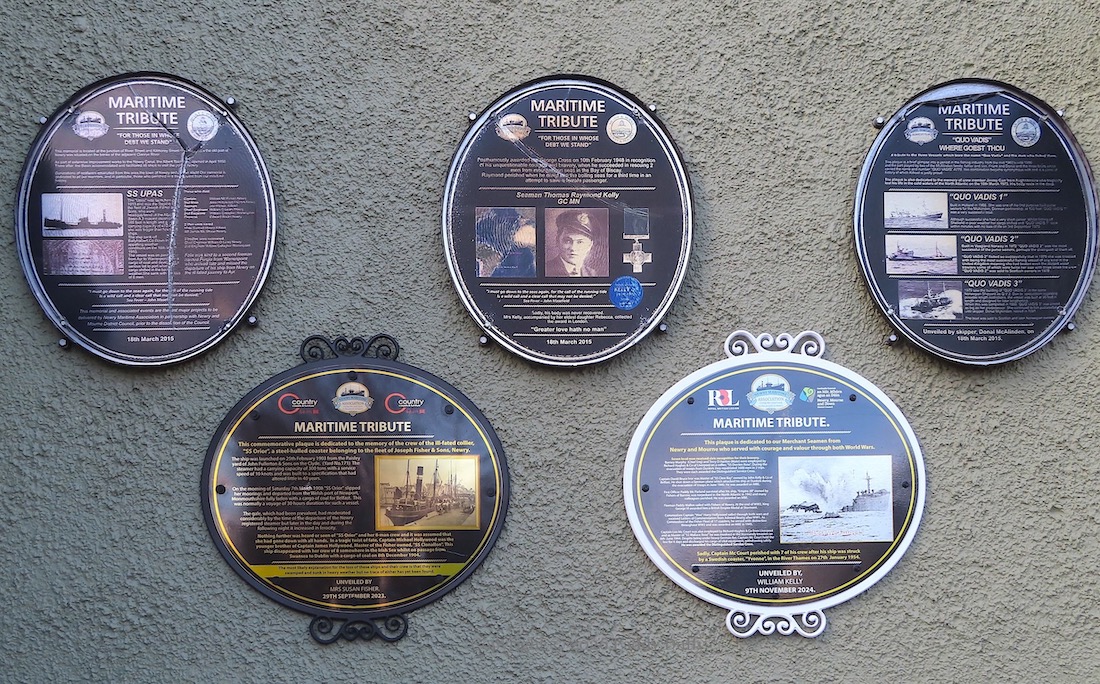 The middle of the three upper plaques in the image above, as well as the blue plaque above them (in the third image), is dedicated to Thomas Raymond Kelly, a merchant seaman who died as he attempted to rescue a third person from heavy seas in the Bay Of Biscay. He was awarded the George Cross for his efforts (Newry Maritime Association).