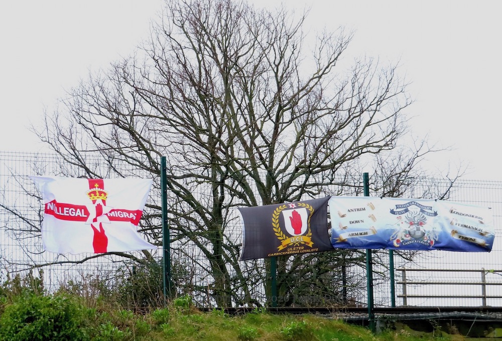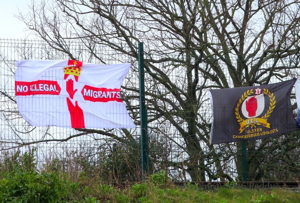 The flags are in North Street and the poster was in Marine Gardens, Carrickfergus.
