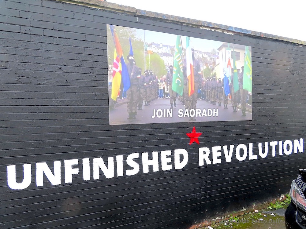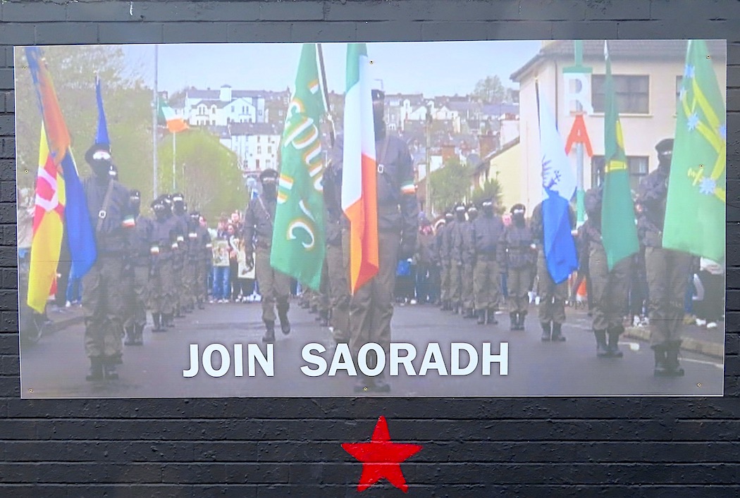 This is a new Saoradh (web) board in Andersonstown, replacing the lettering “Crown Forces Not Welcome“, and before that a Palestinian solidarity mural. (The wall’s long and mixed history can be tracked on the Map.)