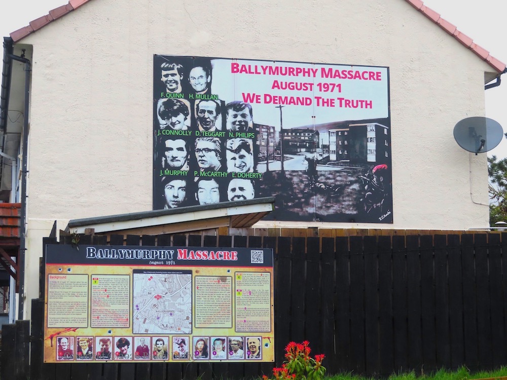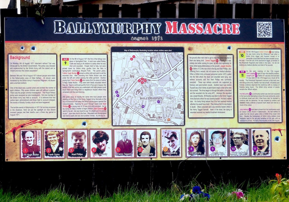 The first panel (on the left) reads, “On Monday 9th of August 1971 Internment Without Trial was introduced by the British Government. The policy was directed and implemented by the British Army with the stated aim to “shock and stun the civilian population”. Between 9th and 11th of August 1971 eleven people were killed in the Ballymurphy area of west Belfast. All eleven were murdered by the British Army’s Parachute Regiment. All eleven were unarmed civilians. One of the dead was a parish priest and another the mother of eight children. Fifty-seven children were left without a parent. There was No proper criminal investigation. The Royal military police were assigned as sole investigators. Not one member of the British Army was held to account. It is believed that had justice been administered and those held to account charged, the events of Bloody Sunday would not have happened.”