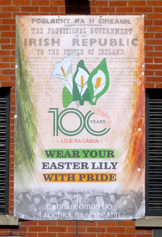 “100 years. Lıle na Cásca. Wear your Easter lily with pride. Tabhaır ómós do laochra na hÉıreann. [Pay respect to Ireland’s warriors]”