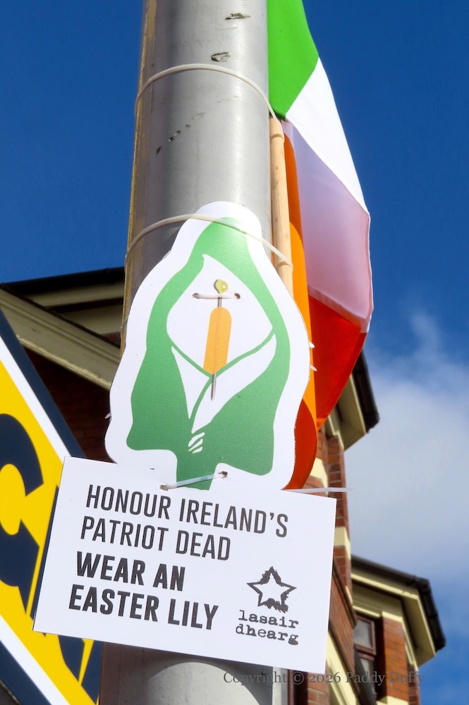Shown here are Sınn Féın (web) and Lasaır Dhearg (web) invocations to commemorate the 1916 Easter Rising. The lily as a symbol of the 1916 Easter Rising was introduced by Cumann Na mBan in 1926 as a fund-raising device. For a history and vintage posters from across the century, see An Phoblacht.