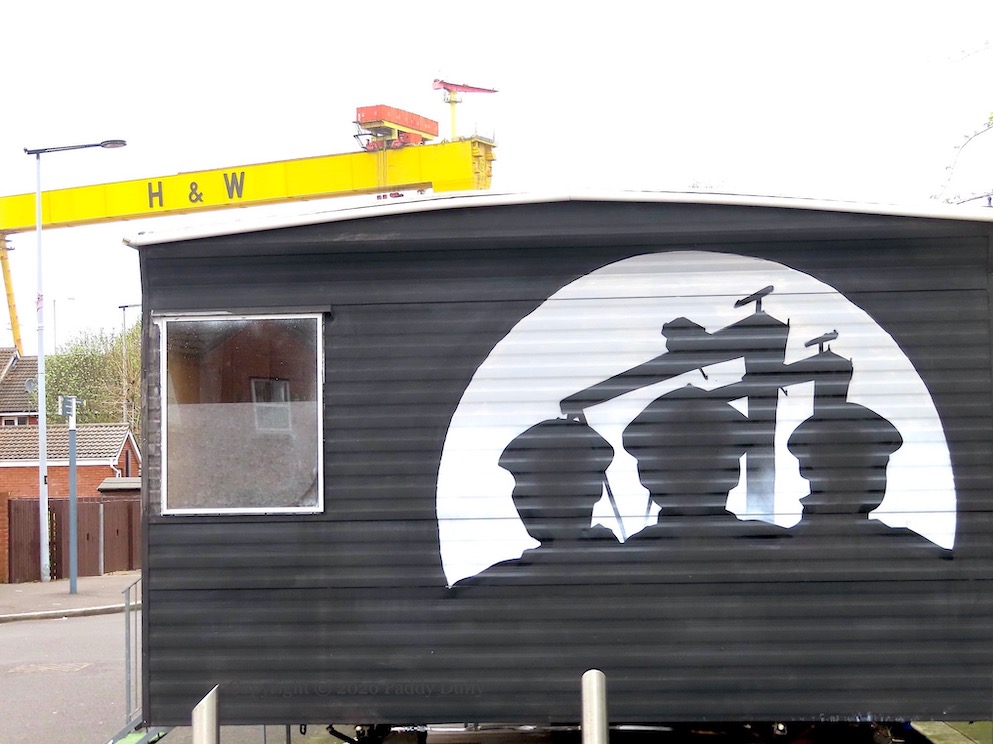 At its peak, the Harland & Wolff shipyard employed 35,000 people (IndustriAll) and the flat-capped worker became a symbol of east Belfast, along – much later – with Samson and Goliath, the two gantry cranes at the shipyard that were raised in 1974 and 1969 (WP) and which have become the symbol of Belfast.