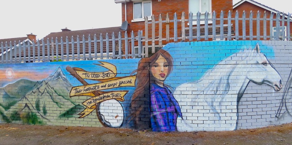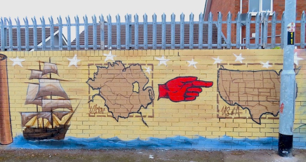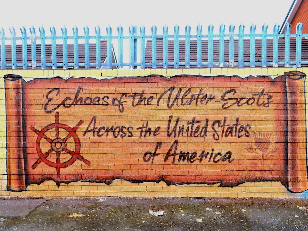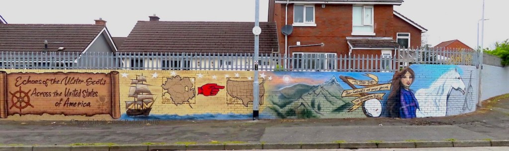 These four panels are the first stage of a longer “pioneers to presidents”-style mural (Visual History) on Ulster-Scots (or, Scotch-Irish) emigration in the 1700s to the British colonies that soon became the United States.