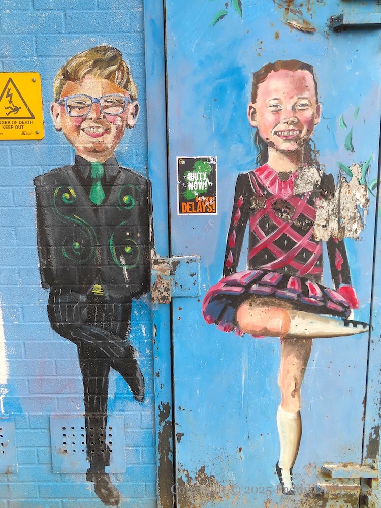 These are images of the sub-station at the green in the middle of Drumbeg. Above are children bearing messages of “happiness” and peace (a second trio of children on the right-hand side of the image above has been blotted out by a large pink splotch). The plaque in the top right reads, “A Shared Space & Services Re-Imaging Project supported by the European Union’s Peace IV Programme”.