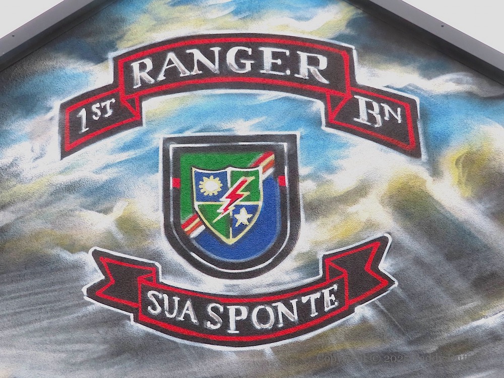 The insignia shown – which is here placed on top of the beret patch – is the insignia of the modern (75th Regiment) Rangers, with the lightning-bolt indicating the unit’s quick-strike abilities (SOF History); these are also alluded to by the motto “sua sponte”, meaning “of its/their own accord”.