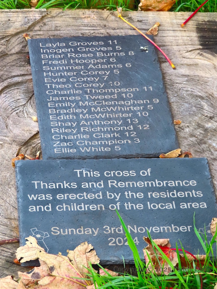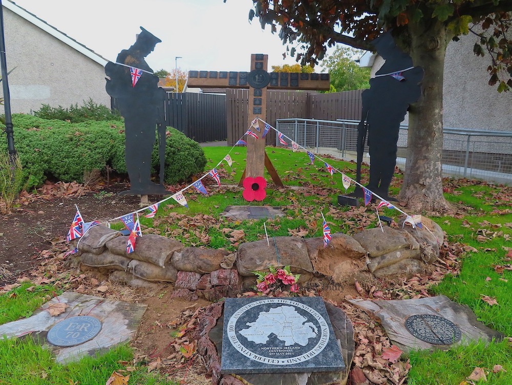 “This cross of thanks and remembrance was erected by the residents and children of the local area, Sunday 3rd November, 2024.” The small black plaques mounted on the cross commemorate a variety of units and individuals from the World Wars, Operation Banner, and the Iraq War, including the British Armed Forces, Royal Inniskillings, Royal Hussars, Women’s Auxiliary Air Force, Royal Irish Rifles, UDR, B Specials, Parachute Regiment, Royal Irish Regiment. In front are three plaques on stones, one marking QEII’s platinum jubilee, the middle one marking Northern Ireland’s centenary, and one on the right marking KCIII’s coronation.