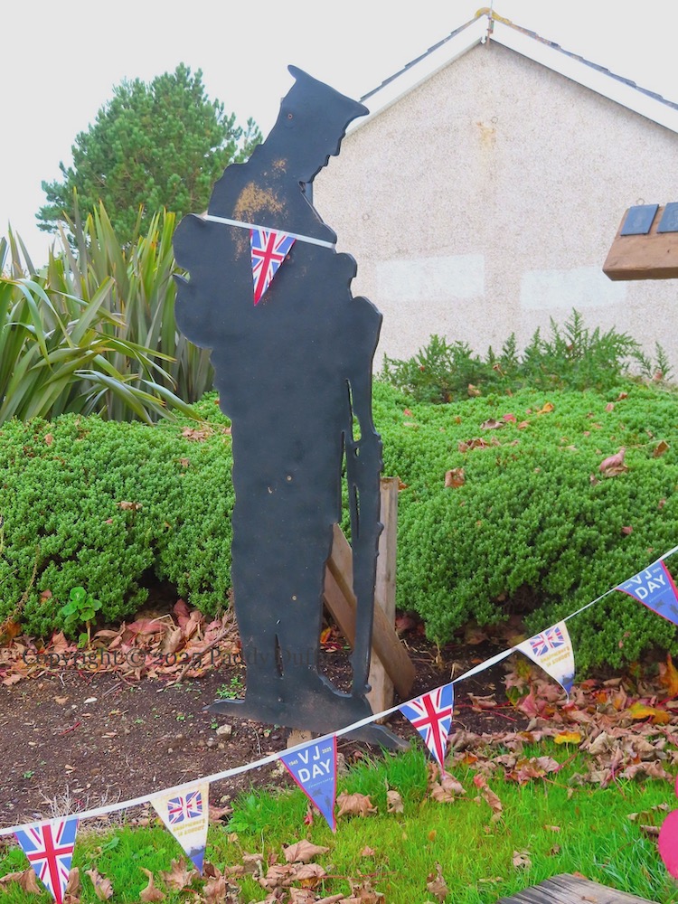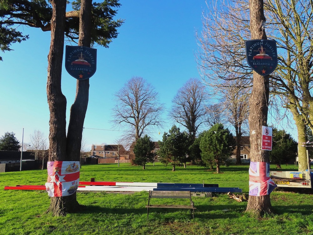 On both tree-trunks are small boards celebrating the “platinum jubilee 1952-2022” of “Her Majesty Elizabeth II”, with flowers of the nations and colonies (rose, thistle, shamrock, daffodil, silver fern, maple leaf) and an Orange star.