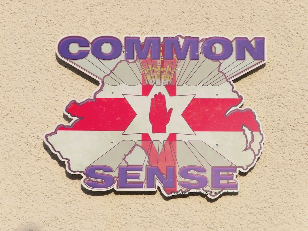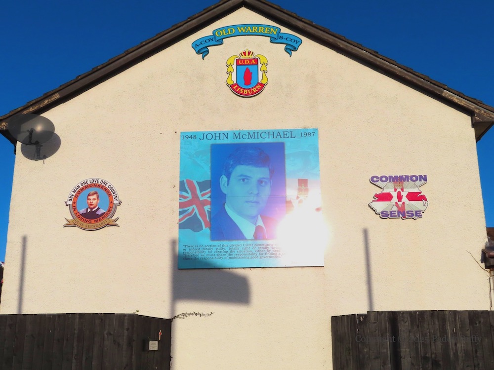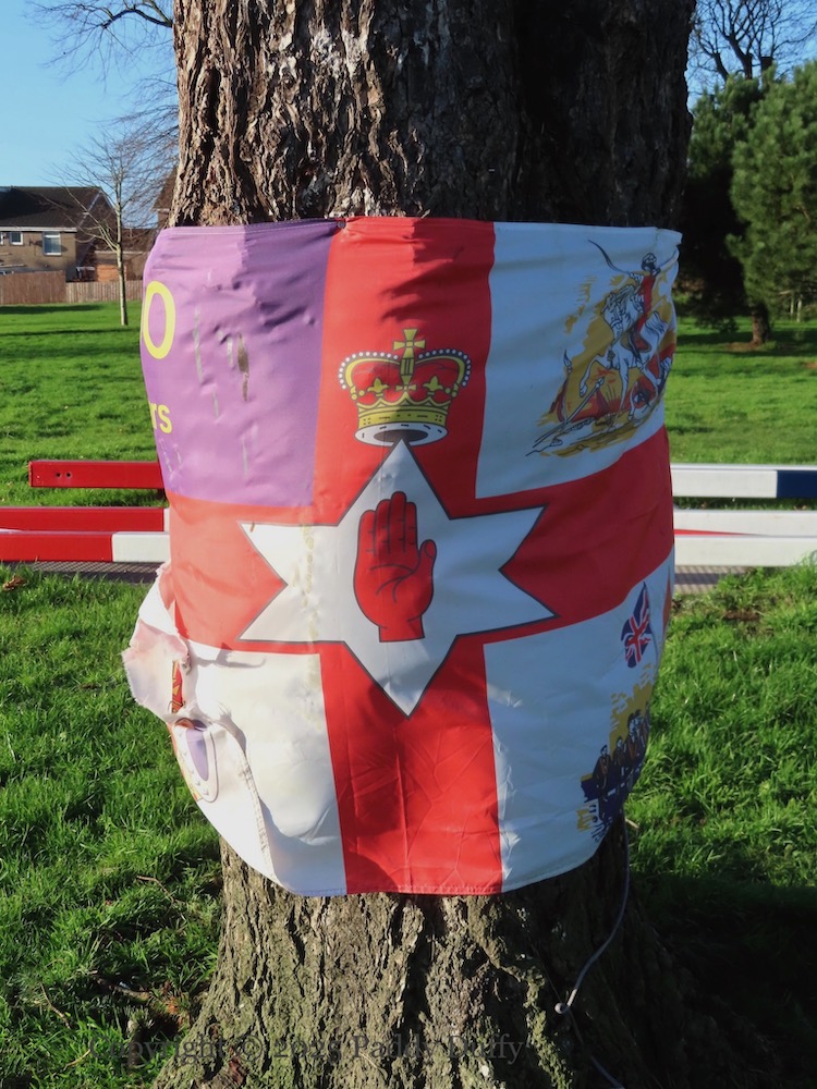 This pair of trees is in Ballymacash next to the bonfire site, hence the “No dumping and fly tipping” sign above the Union Flag on the tree to the right. The flag wrapped around the tree on the left is similar to one seen in 100 Years, an Ulster Banner with quadrants filled with (clockwise) King Billy, an Orange march, the Crown, and (instead of a Union Flag) what looks like UVF purple.