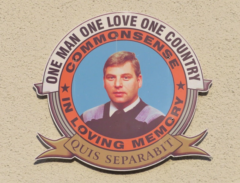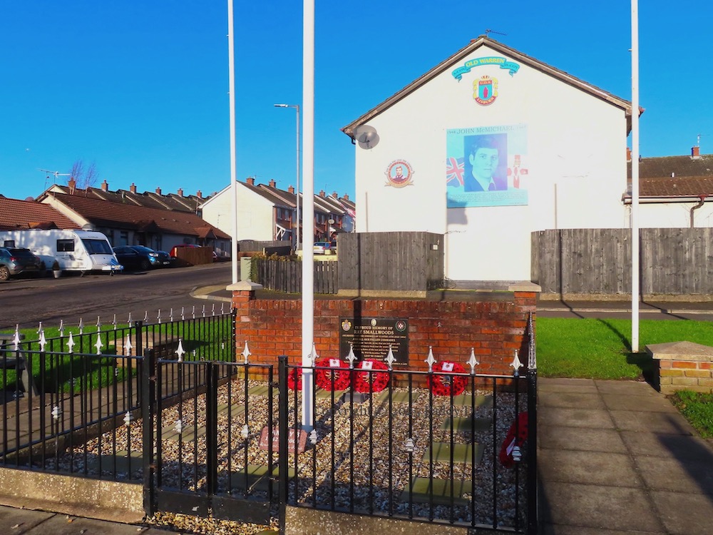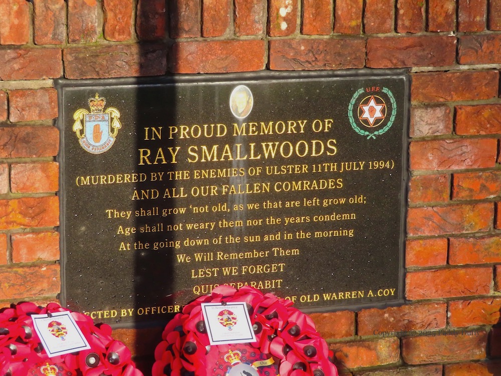 This entry updates 2023’s John McMichael, with close-ups of the smaller boards, in the apex and to either side on the main board, as well as of the stone to Ray Smallwoods, which reads, “In proud memory of Ray Smallwoods (murdered by the enemies of Ulster 11th July 1994) and all our fallen comrades. [For The Fallen] Erected by officers and volunteers of Old Warren A Coy.” Smallwoods was killed by the IRA in the garden of his home in Donard Drive, Lisburn (WP).