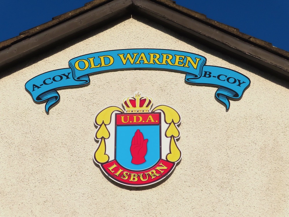 This is a freshly-repainted sign for “South Belfast Ulster Volunteer Force, 2nd battalion, A company Donegall Pass” on the back wall of the Hideout bar. The previous version was painted c. 2005.