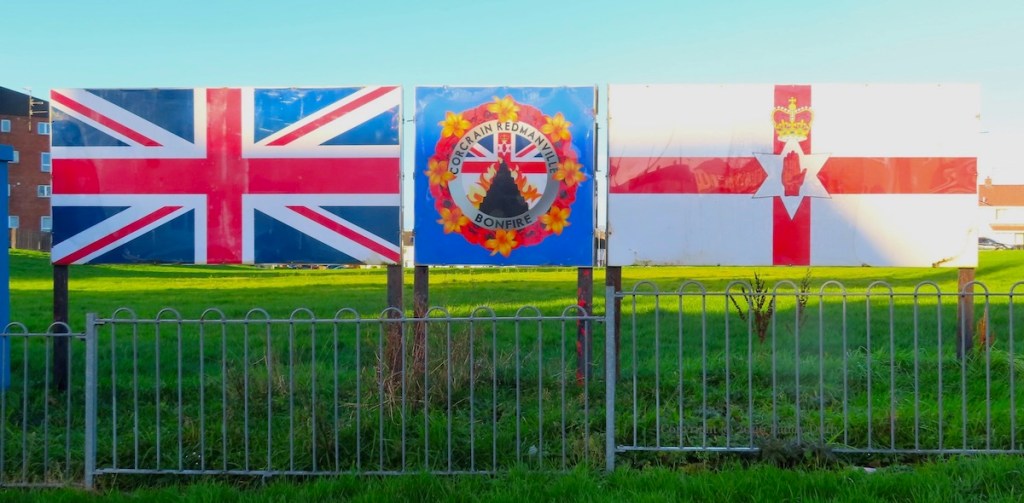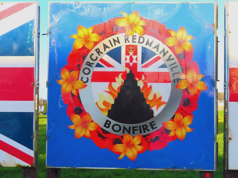 This is the scene at the Corcrain-Redmanville bonfire (Fb) site, along Drumilly Green, where the hut has been moved to the south side of the Green, to join the Union Flag and Ulster Banner.