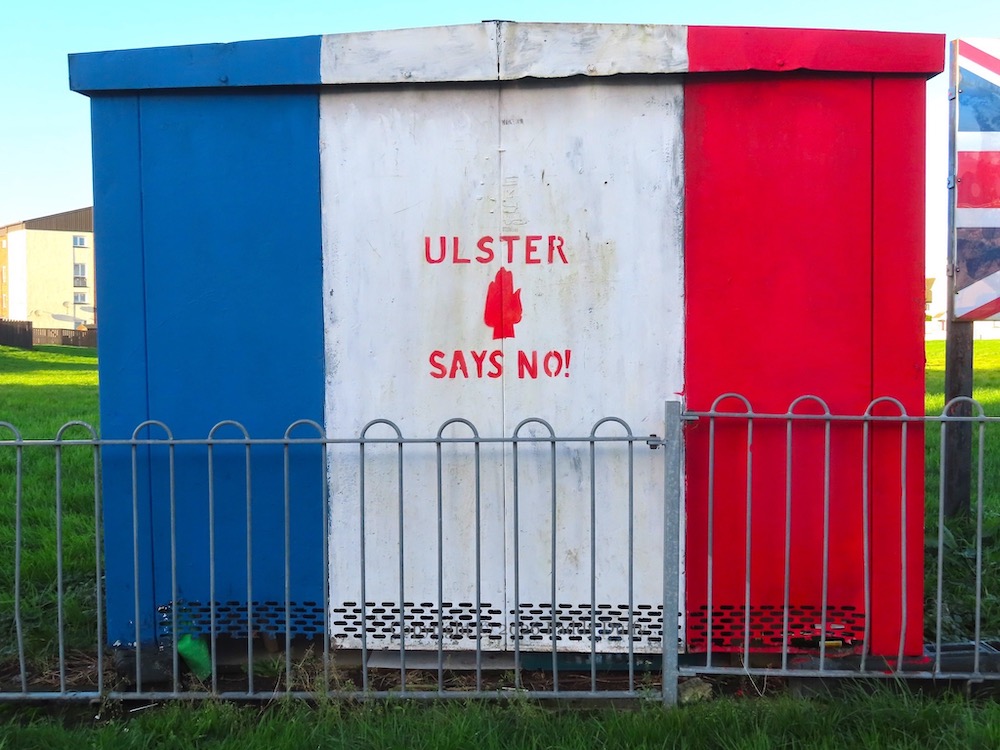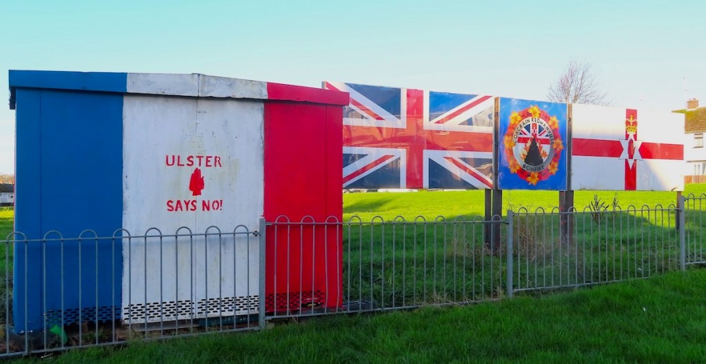 “The loyalist community will protect its residents and homes from: thieves, paedophiles, unwanted graffiti & domestic abusers.” The list of crimes makes no reference to denomination or ethnicity, but “loyalist” and the combined Union Flag and Ulster Banner suggest that the threat comes from those who identify insufficiently with the UK.