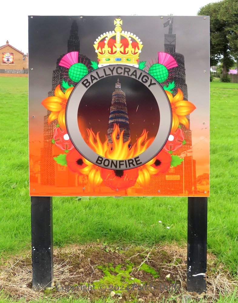 The Ballycraigy bonfire from 2021 (Fb) is at the centre of a new free-standing board that was added this (2024) summer. Around the outside, the rose and thistle are joined by the orange lily and the poppy, rather than the shamrock and daffodil of the “four nations”.