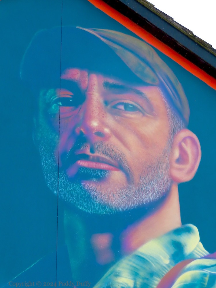 The Denver Smith mural in the Steeple, Antrim, has been replaced with the printed board (shown above and immediately below) which retains the same elements of the mural, including the WWI soldiers and the emblem of the 36th (Ulster) Division. (For information about Smith, see Here Lies A Soldier.)