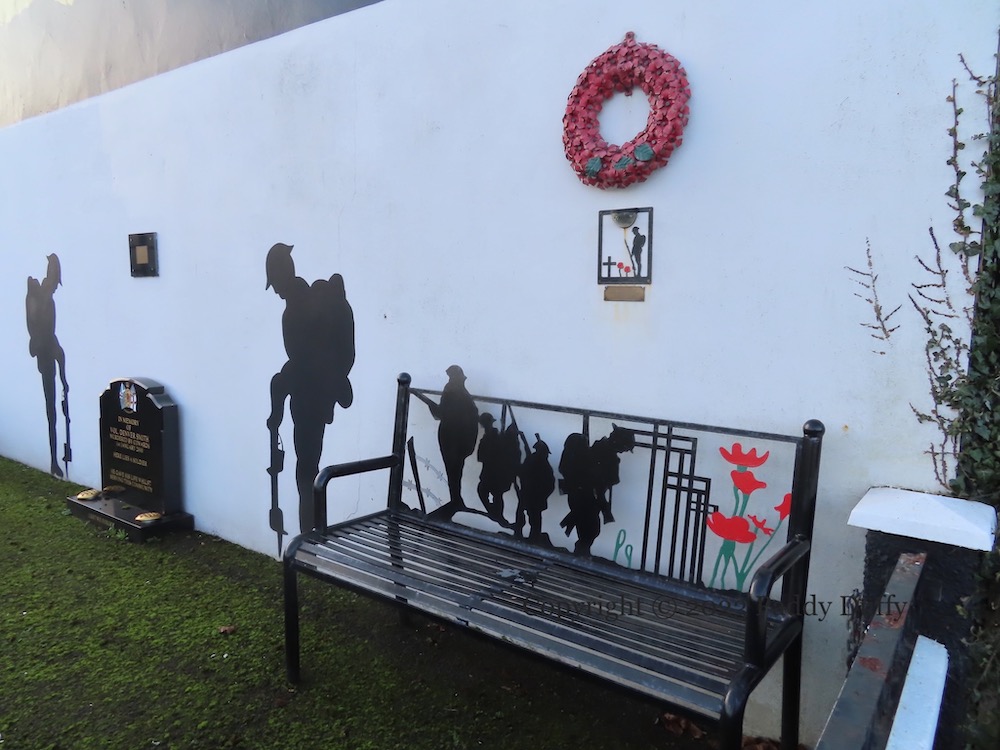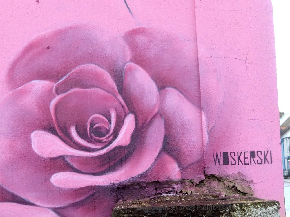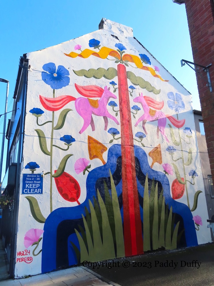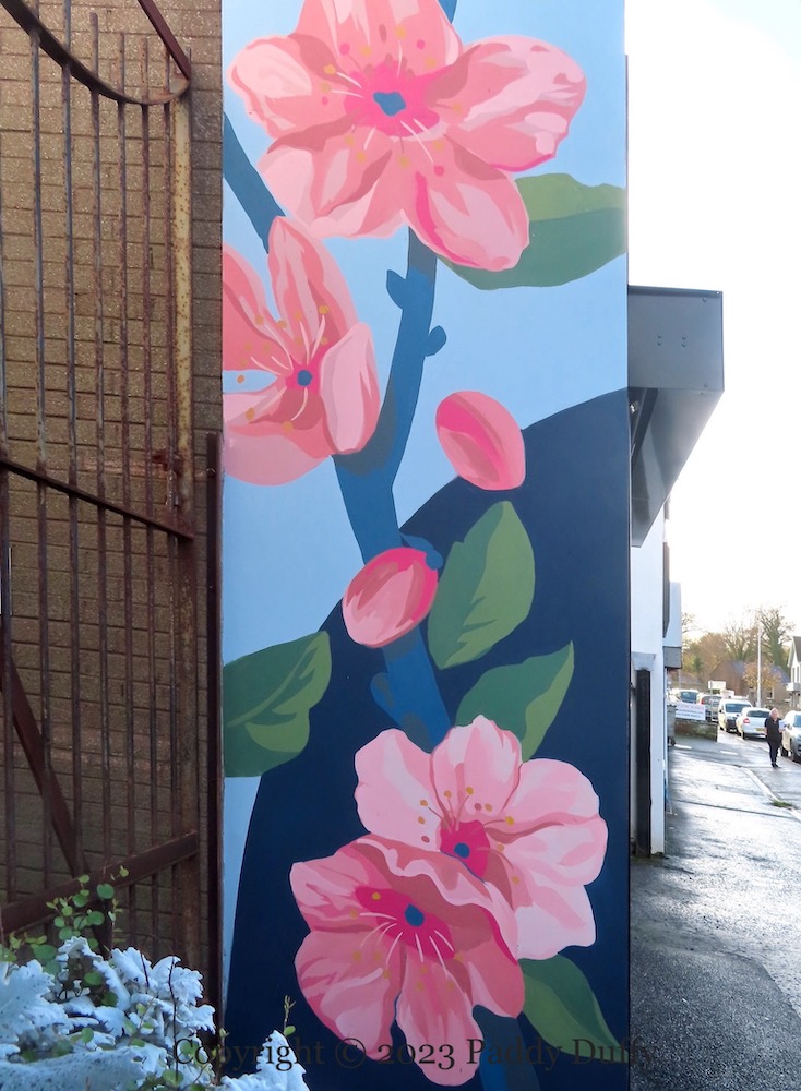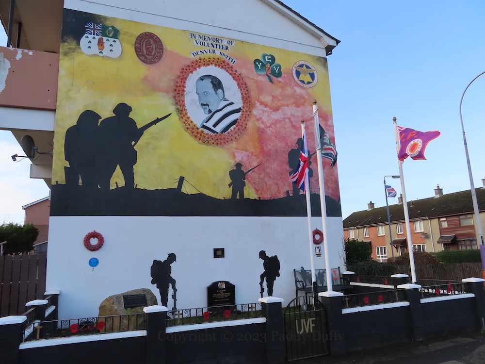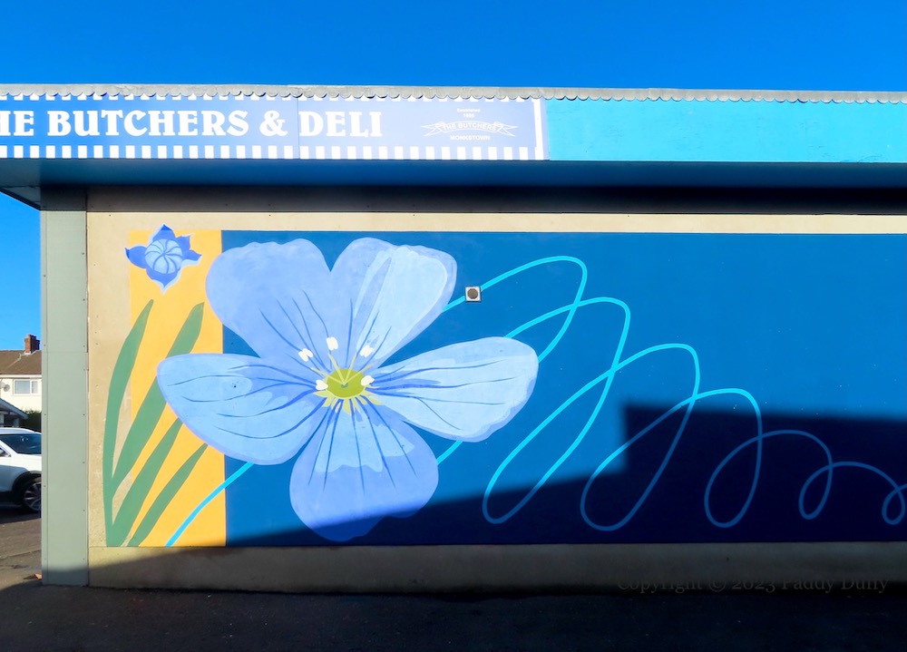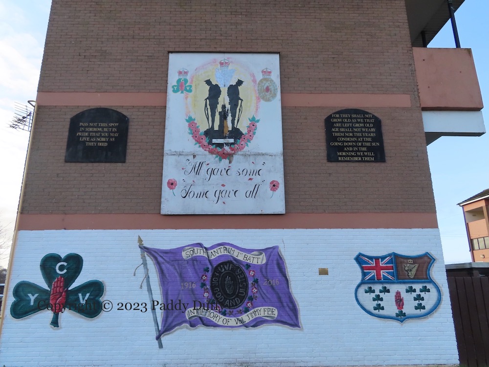 “Alexander Fitzgerald Irvine was an Author, Minister and local resident [of “Antrim Town”] 1863-1941.” The family home where he was raised was in Pogue’s Entry, now a museum and site of the blue plaque, below, outside which sits the mural above (paid for by Lidl) (Antrim Guardian). (ITV video of the house from 1960 and 1963.)