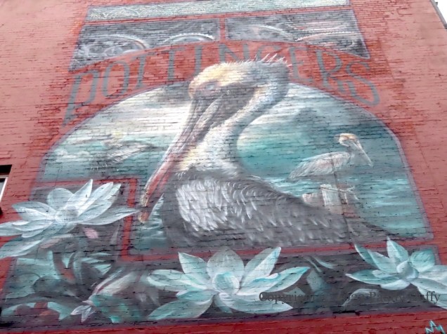 This giant pelican was painted by Nomad Clan (web) from Manchester, England, as part of the first year (2020) of the Belfast Entries Project (Visual History). According to ArtUK, the pelican is a reference to “the Pottinger’s family crest” (Lord Belmont) while the “east Asian flowers” along the bottom and the cogs at the top point “to Belfast’s rich industrial past.