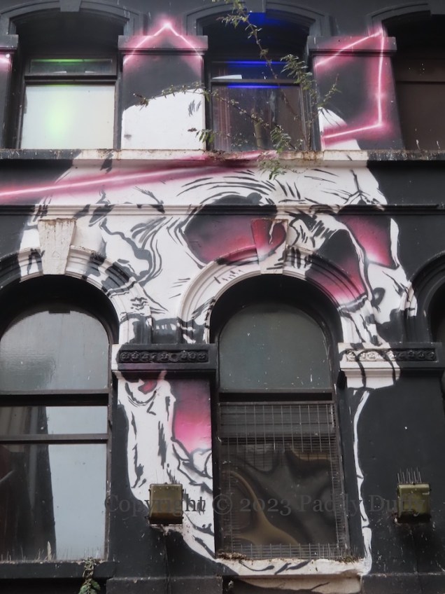 This skull is in Crown Entry, around the upstairs windows of the Paddy Power office. It is not clearly a part of the artistic renovation of the Belfast Entries (Visual History).