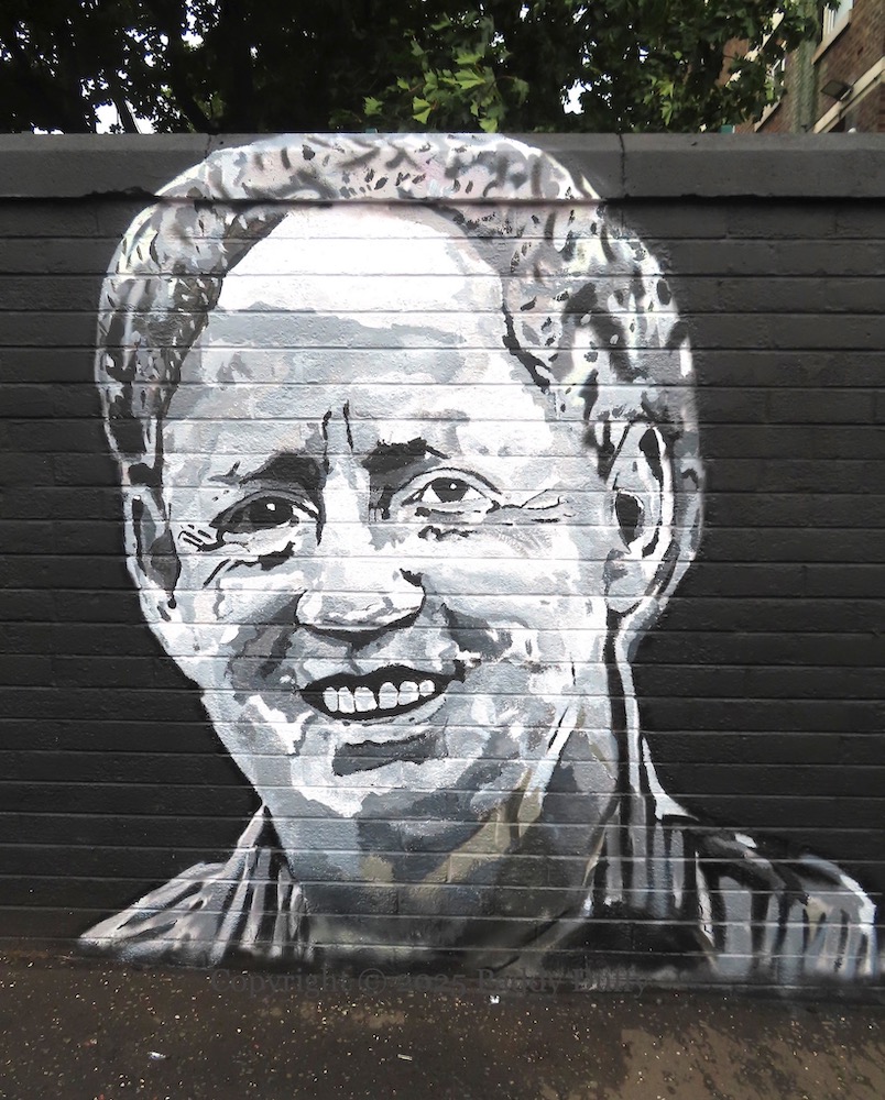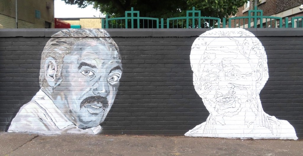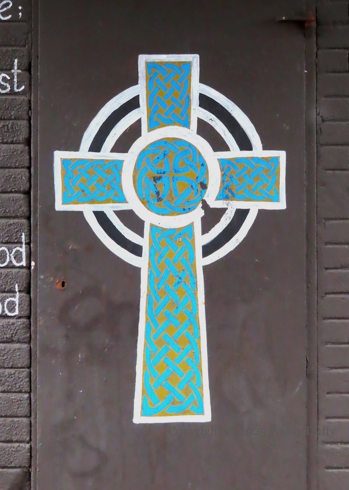 Etna Drive in Ardoyne has undergone a make-over in the last twelve months. The large board below was mounted in December 2024, the planters added in March 2025, and the boxes along the street were painted in June. The boxes celebrate local groups and initiatives: “Cıceam Ard Eoın [Fb]”, “Ardoyne-Bone Community health & leisure trust [Fb]”, “Community larder. Drop in. Locally sourced food.”, “Ardoyne Association [Fb] Citizens’ Advice Centre”, and the “Lawrenson-Toal academy of Irish dance [ig]”.