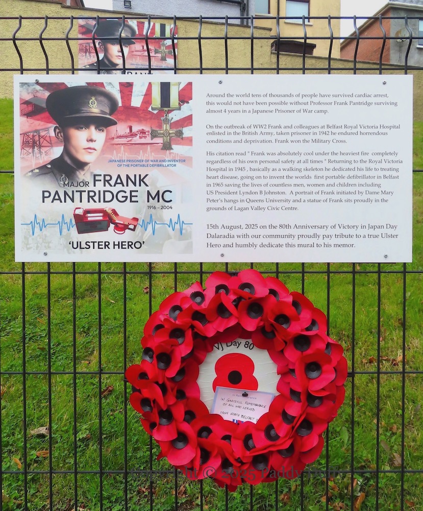 “Japanese prisoner of war and inventor of the portable defibrillator” – Frank Pantridge was born and died in Hillsborough, outside Lisburn and there is a statue of Pantridge with a defibrillator – his key invention – at the Lisburn Civic Centre and he is now remembered by this pair of printed boards on the Shore Road, unveiled on August 16th. He is also included in the nearby gallery of Great Ulster-Scots.
